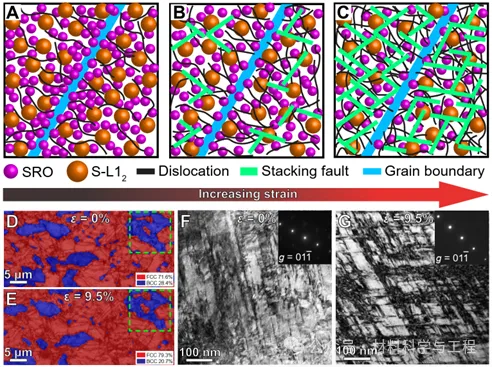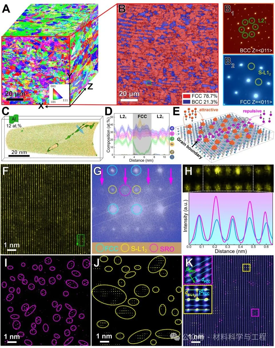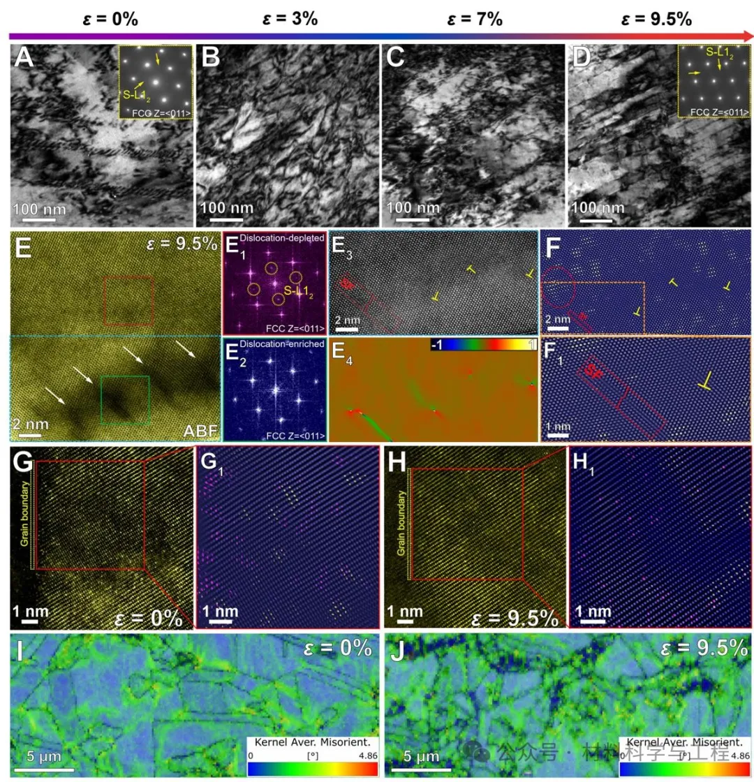 更高的强度和更大的拉伸塑性是结构材料发展的永恒目标。然而,合金的拉伸强度提升至超高水平后(如>2.5 GPa),应变硬化能力通常难以在如此高的流变应力下得到维持。因此,此类合金的均匀延伸率通常<5%应变。近日,西安交大金属材料强度全国重点实验室、微纳尺度材料行为研究中心(CAMP-Nano)吴戈教授-单智伟教授团队联合香港城市大学先进结构材料研究中心吕坚院士、西安交大刘畅教授与西安交大刘思达教授,设计了一种创新纳米结构,即短程有序界面与超纳析出相的结合,来克服此难题。其中,超纳(Supra-nano)概念为吴戈教授与吕坚院士在Nature 545, 80 (2017)中提出,意为结构特征尺寸小于10 nm。通过在材料中引入超纳结构单元,整体材料会展现出一些奇异性能。如,在多晶材料中,通过将晶界结构扩展为超纳非晶相,可克服晶界的软化效应,使材料的强度提升至近理论值(吴戈、吕坚等,Nature 545, 80 (2017);Nat. Commun. 10, 5099 (2019))。在非晶材料中,通过两种超纳非晶畴的复合结构设计,可使整体非晶合金具备均匀塑性流变行为,克服非晶合金的脆性问题(吴戈等,Nat. Commun. 14, 3670 (2023))。本研究中,超纳析出相(S-L12)大幅提高了FCC-BCC双相合金的应变硬化能力。另外,短程有序界面可视为一种新的晶界复合体,可有效提高屈服强度以及避免塑性变形过程中的晶界开裂。这种结构设计使得细晶VCoNi-W-Cu-Al-B合金(SS-合金,Supra-nano+SRO)实现了2.6 GPa的抗拉强度和10%的均匀延伸率。与其它权威期刊报道的合金相比,SS-合金具备异常优异的强度和均匀延伸率组合。此工作以“Ductilization of 2.6-GPa alloys via short-range ordered interfaces and supranano precipitates”为题发表在Science。西安交通大学金属材料强度全国重点实验室为论文第一作者单位和第一通讯单位。吴戈教授(西安交通大学)为论文第一通讯作者,闫永强博士生(西安交通大学)为论文第一作者,察文豪科研助理(西安交通大学)为论文共同一作。吕坚院士(香港城市大学)、刘畅教授(西安交通大学)及刘思达教授(西安交通大学)为论文共同通讯作者。作者包括:单智伟教授(西安交通大学),马焱助理教授(荷兰代尔夫特理工大学),栾军华博士(香港城市大学),饶梓元副教授(上海交通大学)。该研究得到了国家自然科学基金委-香港研资局合作项目、国家自然科学基金委面上项目及国家青年人才计划的支持。https://www.science.org/doi/10.1126/science.adr4917区别于以往报道的位于晶粒内部的短程序,本研究中调控短程序在晶界附近偏聚(与FCC基体具有正的界面作用能),形成短程有序界面,实现了与晶界相关的显著强化和塑化机制。此SS-合金为细晶FCC-BCC双相合金(两相的晶粒尺寸均为1 μm)。较小的晶粒尺寸使得位错与晶界的交互作用被增强。因此,FCC相中短程有序界面的强塑化作用显著。短程序在晶界附近的偏聚有效提高了抵抗位错运动所需的应力水平,使得屈服强度大幅提升至2.2 GPa。在塑性变形过程中,晶界附近的短程序会发生向无序固溶体的转变,降低了晶界附近的应力集中,避免界面开裂。另一方面,在FCC晶粒内部析出的超纳L12相,相比于短程序(<1 nm)有较大的尺寸(0.5~4 nm),因此其对位错和层错有更强的钉扎效应。因此,塑性变形过程中位错在晶粒内部持续增殖和累积,提高了合金的应变硬化能力。此外,由于塑性变形过程中的超高应力水平,在FCC-BCC相界面处发生BCC到FCC的相变(FCC相分数增加7.7%)。相界面附近的异质变形带来背应力硬化效应,促进应变硬化,而变形过程中的动态相变会缓解相界面处的应力集中,使合金的均匀拉伸变形得到维持。这些变形机制促使变形过程中流变应力的持续增加,直至合金在2.6 GPa应力、10%应变时断裂。本研究中晶粒内部和晶界附近的有序结构设计策略为实现超强合金的优异均匀延伸率(且具备持续应变硬化)提供了一条新途径。图1 SS-合金的结构。(A) 三维EBSD反极图(IPF)。(B)为(A)中方形区域的相分布图,显示FCC-BCC双相结构。(C) 三维重构APT数据集。(D)为(C)中箭头所示区域的成分图。(E) MD计算结果示意图,显示SRO和S-L12颗粒分别在晶界附近偏聚和晶粒内部析出。(F) FCC相的HAADF-STEM图。(G)为(F)的FFT图。(H)为(F)中绿色虚线矩形区域放大的HAADF-STEM图。(I)和(J)分别对应(G)中SRO和S-L12弥散圆盘和衍射斑点的IFT图。(K) 利用(G)中FCC、SRO和S-L12的弥散圆盘和衍射斑点叠加的IFT图。图2 SS-合金的室温拉伸性能。(A) 具有不同SRO和S-L12含量合金的工程拉伸应力-应变曲线。(B) 合金在拉伸过程中的应变硬化率。插图为拉伸过程中SS-合金中FCC相的位错密度演化图。(C) 本研究中的SS-合金与其他超强多主元合金的室温拉伸力学性能对比图。图3 SS-合金中FCC相在拉伸过程中的结构演变。(A-D) FCC相在不同拉伸应变下的明场TEM图,显示了位错和层错的演变。(E) FCC相在9.5%拉伸应变下的ABF- STEM图。(E1和E2) 分别从(E)中红色和绿色方形区域得到的FFT图。(E3)为(E)中位错富集区放大的HAADF-STEM图。 (E4) 为(E3)基于GPA的对应应变图。(F) 为(E3)生成的叠加IFT图,显示位错/层错与S-L12相之间的交互作用。(F1)为(F)中虚线矩形区域的放大图。(G) FCC区域未变形状态下晶界附近的HAADF-STEM图。(G1)为(G)中红色方形区域生成的叠加IFT图,显示SRO在晶界附近偏聚。(H) FCC区域经过9.5%拉伸应变后的HAADF-STEM图。(H1)为(H)中红色方形区域生成的叠加IFT图。变形后,SRO在晶界附近以及晶粒内的分布是均