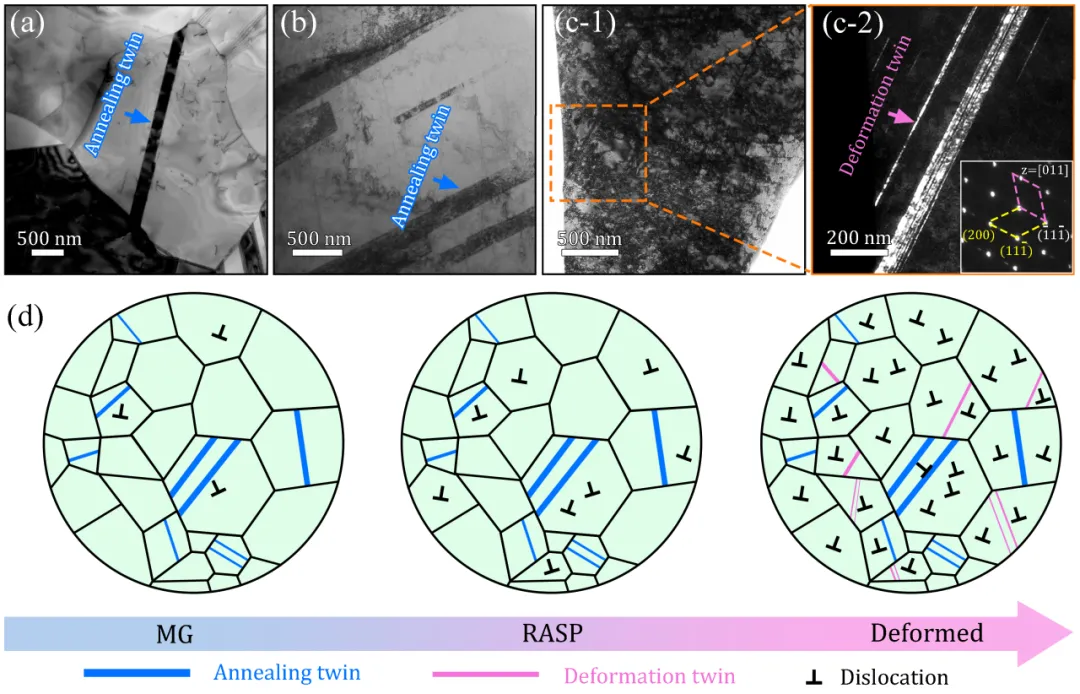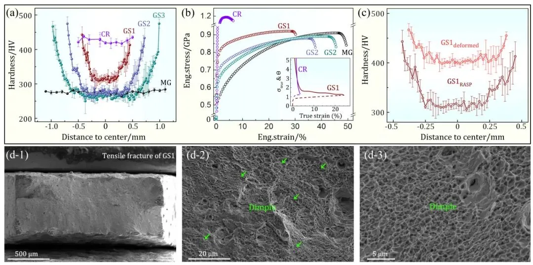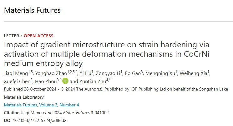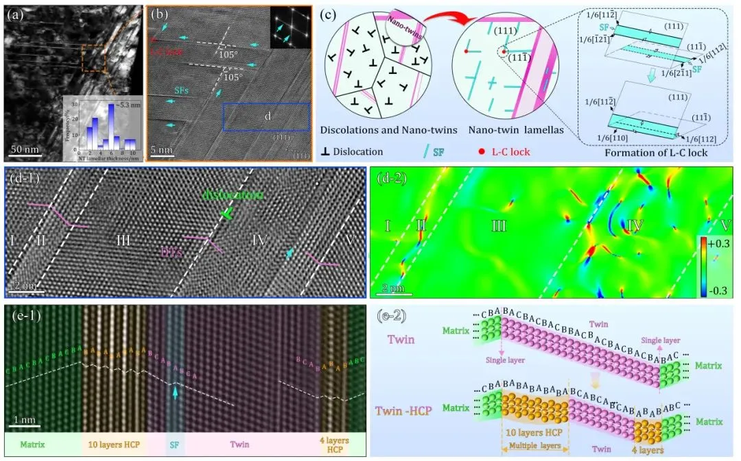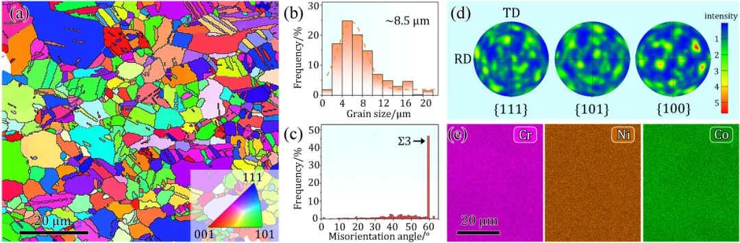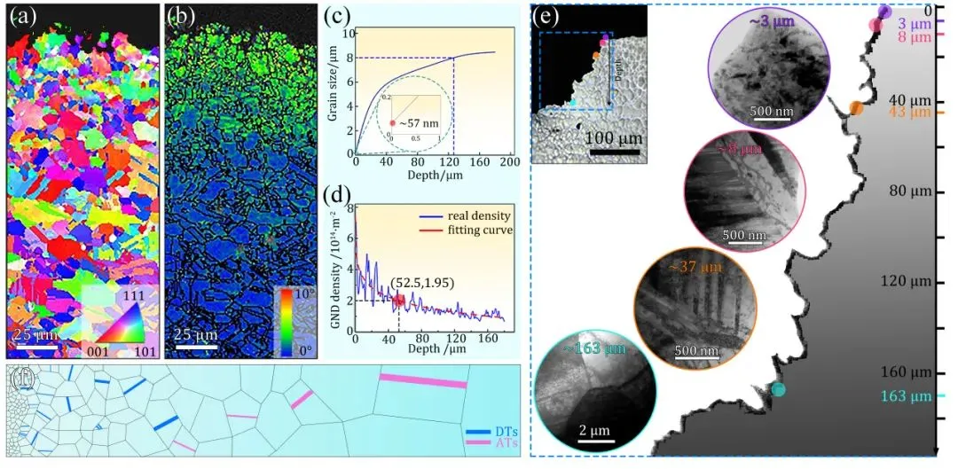 文章导读 面心立方(FCC)结构的中高熵合金(M/HEAs)以其优异的强度和延展性吸引了研究界的广泛关注,引入梯度结构(GS)可进一步增强其力学性能。在本研究中,南京理工大学材料科学与工程学院纳米异构中心团队联合辽宁材料实验室、河海大学、香港城市大学,采用旋转加速喷丸技术在CoCrNi FCC MEA中引入梯度结构,以研究通过其塑性变形过程的潜在机制,主要目标是减轻强度和延性之间的内在权衡。通过沿深度方向、单轴拉伸塑性变形前后的显微组织分析,揭示了CoCrNi MEA心部区多种缺陷的出现:纳米级变形孪晶、层错、L-C位错锁和孪晶边界从FCC到HCP的相变协同增强了材料的应变硬化能力,相关工作以“Impact of Gradient Microstructure on Strain Hardening via Activation of Multiple Deformation Mechanisms in CoCrNi Medium Entropy Alloy”为题发表在期刊Materials Futures上。 关键词:CoCrNi MEA、异构材料、孪生、相变、加工硬化 CITATION: Jiaqi Meng et al 2024 Mater. Futures 3 041002 文章亮点 1 梯度组织显著提高了CoCrNi合金的加工硬化能力,远远超过传统轧制方法的性能。 2 当孪晶边界间距低于5 nm时,纳米孪晶表现出意想不到的软化效应。 3 连续和稳定塑性变形的潜在机制是由肖克利部分位错的有序滑移引起的孪晶边界从FCC到HCP相变的激活。 4 位错滑移、孪晶、层错和相变在内的一系列变形机制共同增强了材料的应变硬化 研究背景 FCC CoCrNi MEA由于其在室温下的低屈服强度而限制了实际应用。通过“表面纳米化”可以在试样表面产生剧烈的塑性变形,细化材料表面的晶粒尺寸,并将梯度晶粒和纳米孪晶梯度等微观结构引入材料,从而提高材料的力学性能和应变硬化能力。在梯度结构(GS)材料中,初始拉伸变形阶段主要表现为心部区域塑性变形。随后,塑性变形向表面转移,引入协调变形机制和额外的应变硬化层。然而与传统金属相比,MEAs/HEAs的变形机制仍然很复杂。目前,驱动梯度结构应变硬化效应的微观复杂性尚不清楚。GS材料的塑性主要受心部区基体区域的影响,因此探讨其心部区的变形机制显得尤为重要。 本文要点 01 初始微观组织 为了细化铸态CoCrNi合金的粗晶粒尺寸(~250 µm),通过室温轧制和退火,使得晶粒明显细化(~8 µm,后续称为MG样品),并形成了完全再结晶的微观结构,位错密度降低(图1a-b)。退火后的样品显示出高体积分数的Σ3晶界(图1c),表明在晶粒内形成了高密度退火孪晶。退火后的CoCrNi试样呈现出弱而随机的织构(图1d)。EDS分析证实元素分布均匀,偏析可以忽略不计,表明热处理后不存在析出物或金属间化合物(图1e)。 图1 通过冷轧和退火对CoCoNi样品进行晶粒细化:(a) IPF图显示晶粒形貌和结晶取向;(b)晶粒尺寸分布图;(c)相邻晶粒间晶界取向差;(d)代表{111}、{101}和{100}的极图;(e) Cr、Ni、Co元素的能谱图。 02 梯度CoCrNi的微观结构 图2 GS1样品从表面到深度为180 µm的横截面上的梯度晶粒尺寸:(a) IPF图显示了晶粒形貌和晶体取向;(b) KAM图,说明了局部的取向偏差和应变分布;(c)粒度随深度的变化;(d) GNDs密度在不同深度上的分布;(e)在指定深度3 µm、8 µm、37 µm和163 µm处捕获的TEM图像;(f)样品梯度结构示意图。 03 力学性能 图3 MG、GS1、GS2和GS3不同晶粒组织的CoCrNi合金力学性能:(a)显微硬度在试样厚度上的分布;(b)工程拉伸应力-应变曲线,插入曲线表示相应的应变硬化率;(c)拉伸试验前后GS1试样显微硬度对比;(d-1)- (d-3) GS1断裂面SEM显微图。 04 微观变形机制 TEM分析显示样品退火后以退火孪晶为主要特征(图4a)。经过RASP处理后(图4b),心部区域显示出纳米孪晶和晶粒基体内部位错的轻微增加,表明在塑性条件下发生了变形。在整个单轴拉伸变形过程中,心部经历了明显的塑性变形升级,如图4c-1和c-2所示。图4d显示了微观组织的演变过程,强调了位错密度和纳米孪晶组织在应变硬化过程中的作用。图4d显示了两步塑性变形过程中中心的组织演变,包括RASP和拉伸试验。在初始阶段,RASP加工导致典型的非均匀塑性变形,从表面延伸到心部。虽然表面经历了相当大的塑性变形,但核心经历了最小的变形,仅显示出位错密度的轻微增加。而在后续的单轴拉伸过程中,材料发生均匀塑性变形,随着变形的进行,导致心部内缺陷密度显著增加。 图4 RASP和拉伸试验变形过程中的显微组织演变:(a)、(b)和(c-1) MG、RASP和拉伸试样在厚度为150 µm时的亮场TEM图像;(c-2)为(c-1)中橙色虚线框所标记区域的特写视图;(d)微观结构演变示意图。 通过高分辨(HRTEM)进一步观察了拉伸变形后心部高密度缺陷的详细结构。图5a-b显示了断口试样内高密度的纳米孪晶,层错(SFs)。不同{111}晶面上的SFs通过相互作用形成了L-C位错锁的形成(图5c),随着纳米孪晶的细化以及SFs变得活跃,导致了额外的应变硬化。通过对纳米孪晶片层进一步深入观察发现片层宽度大于5 nm的纳米孪晶片(如图5d-1中的“I”和“III”所示)由于内部缺陷密度较低,局部应变最小。相比之下,较窄的薄片(标记为“II”和“IV”)在孪晶界处表现出显著的应变场,表明这些残余的层错对位错滑移存在实质性障碍,以及纳米级层错引起的局部应变升高(图5d-2)。通过HRTEM揭示了当片层厚度低于5 nm时,导致孪晶边界处从FCC到HCP的局部相变。这种相变机制只有在纳米孪晶细化到一定程度时才会发生,从而在拉伸变形后期产生必要的应变硬化。这对于在高流变应力下提供连续稳定的塑性变形能力至关重要(