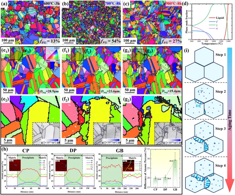 图 9.异质晶粒结构的形成机理:(a-c) 经历不同老化过程的样品的 IPF 图像,显示不同的 FGs 分数。三个样品的固溶处理与 MEA-SS 相似。(d) (CoCrNi) 的平衡相图94到3钛3使用 Thermo-Calc 软件计算。它显示了平衡相的摩尔分数随老化温度的变化。原位900 °C 下 MEA-SS 时效的 EBSD 实验:(e1-克1) IPF 图像显示晶粒尺寸分布随时效时间的增加而演变。(e2-克2) 放大的 IPF 和在 (e 中标记的区域的相应 GND 映射1-克1).(h) 元素分数与距离曲线以及通过 STEM-EDX 获得的结果跨不同边界的结果,以 Ni 为例。(i) FG 形成的示意图。