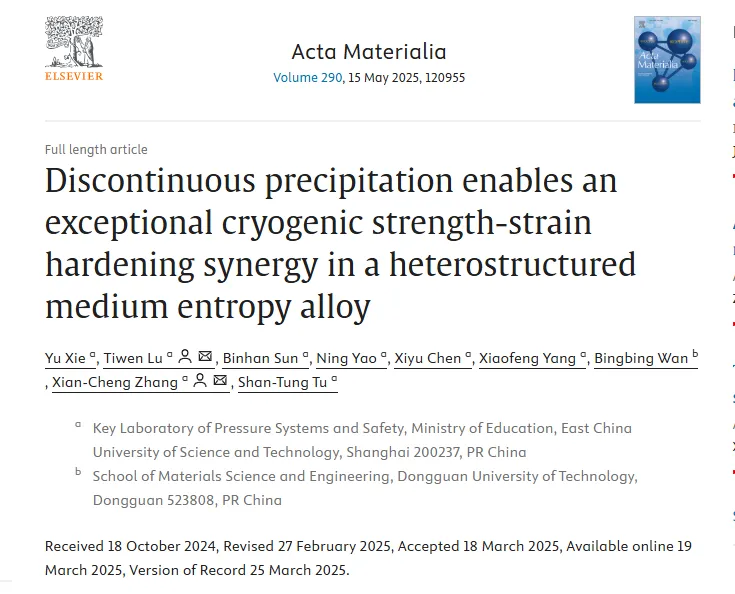 有关此课题,华东理工大学等学者进行了深入研究,相关研究成果以“Discontinuous precipitation enables an exceptional cryogenic strength-strain hardening synergy in a heterostructured medium entropy alloy”发表在Acta Materialia上