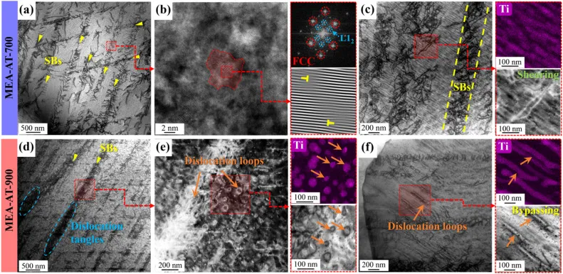 图 6.MEA-AT-700 和 MEA-AT-900 在低温下具有 4% 应变的典型变形结构。(a) 和 (c) 明场 TEM (BF-TEM) 图像显示了 MEA-AT-700 在 CP 区和 DP 区的位错平面滑移特性。(b) HR-TEM 及其相应的 FFT 图谱和右侧的 IFFT 图像显示了 CP 区域的剪切机制。Ti 的 STEM-EDX 元素映射以及 (c) 右侧的 DF-TEM 也显示了 DP 区域的剪切行为。(d) BF-TEM 图像显示了 MEA-AT-900 中的高密度弯曲位错和位错缠结。(e) 和 (f) DF-TEM 和 BF-TEM 图像以及 Ti 的 STEM-EDX 元素映射以及放大的 BF-TEM 图像显示了 CP 和 DP 区域的 Orowan 机制。