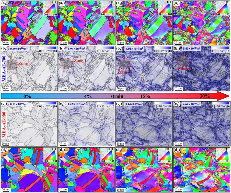 图 5.低温变形过程中 MEA-AT-700 和 MEA-AT-900 的原位 EBSD 结果。(一个1-一个4) 和 (d1-d4) 两个样本的 IPF。随着变形程度的增加,晶粒表现出明显的变形。(乙1-b4) 和 (c1-c4) 两个样本的 GND 分布图。图像显示,随着应变的增加,GND 的密度呈异质分布。更多的 GND 位于 FG 区域中,例如区域 1 由 b 中的红色虚线循环突出显示1-b4.