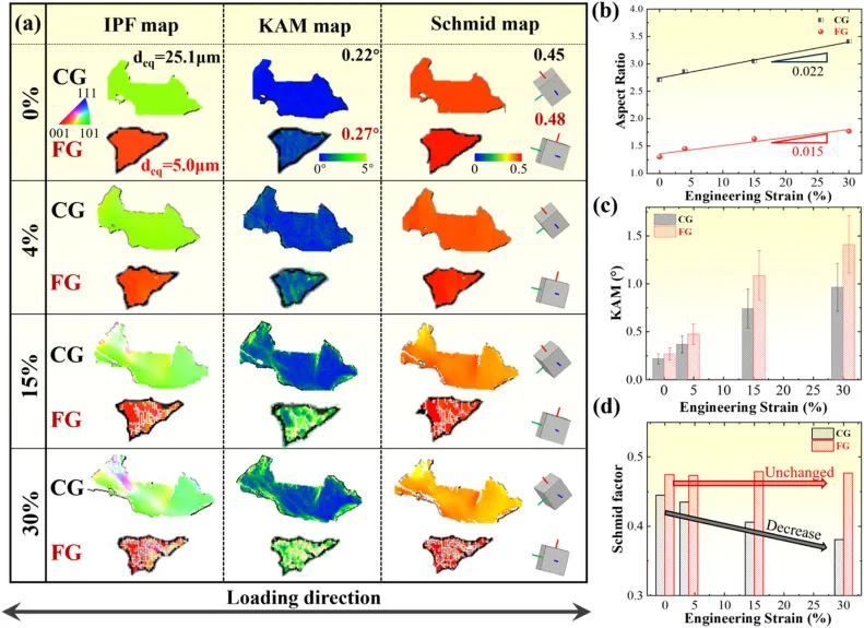 图 4.低温变形过程中 MEA-AT-700 中典型 FG 和 CG 的 Schmid 因子值和 KAM 值的变化。(a) 随机选择的 CG 晶粒和 FG 晶粒在不同菌株 (0%、4%、15% 和 30%) 下的形貌及其 IPF 图、KAM 图和 Schmid 图。(b) 所选 FG 和 CG 的纵横比的演变。(c) 和 (d) 通过统计大量 FG 和 CG 获得的平均 KAM 值和 Schmid 因子值的演变。