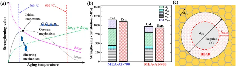 图 10.沉淀强化的示意图以及屈服强度和流应力的计算。(a) 示意图描述了沉淀物剪切应力和 Orowan 位错循环应力随老化温度的变化。(b) 不同强化机制对 YS 的贡献以及计算值与实验值的比较。(c) 异质材料中三个不同部分(FGs、常规 CGs 和 HBAR)的面积分数示意图。