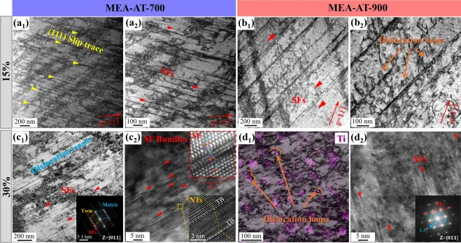 图 7 .MEA-AT-700 和 MEA-AT-900 的典型变形结构在低温下具有 15% 的应变和 30% 的应变。(一个1-2) BF-TEM 图像显示 SB 和一些 SF 表明平面滑移特性。(乙1-2) BF-TEM 图像显示 SF 的存在和沉淀物周围的位错环。(c1) BF-TEM 图像显示了 MEA-AT-700 中的 SF 束,SAED 模式进一步证实了 SF 的特性和纳米孪生 (NT) 的存在。(c2) HR-TEM 和放大图像显示了 MEA-AT-700 中的 SF 束和 NT。SF 和 NT 的相关 FFT 模式见补充图 S6。(d1) 通过叠加 BF-TEM 和相应的 STEM-EDX 图获得的图像,显示沉淀物周围存在高密度弯曲位错,表明 Orowan 机制诱导显着的位错交叉滑移。(d2) HR-TEM 和插入 FFT 图像证实了低密度 SF 的存在。