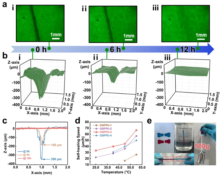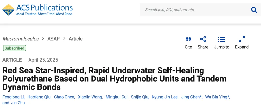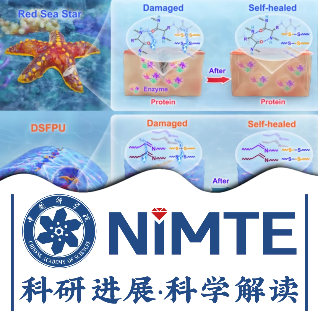 自愈合聚氨酯以动态键作为自愈合驱动力,能够从结构和功能损伤中自我愈合,从而增加使用寿命,提高可靠性和耐用性。但是,水分子会干扰动态键的可逆重排过程,进而降低自愈合速度,难以满足水下机器人、植入式医疗器械等场景的使用需求。在这一需求下,迫切需要开发一种能够室温水下自愈合的聚氨酯。 中国科学院宁波材料技术与工程研究所生物基高分子材料团队长期从事生物基、自愈合聚氨酯的研究。 前期研究成果 Eur Polym J, 2025, 224, 113709; Adv Funct Mater, 2024, 34, 2402380; Nat Commun, 2024, 15, 2129; Chem Eng J, 2024, 497, 155467; ACS Appl Polym Mater, 2024, 6, 4070; Chem Eng J, 2024, 479,147823; Small, 2023, 19, 2303215; Prog Chem, 2023, 35, 1275; Macromol Biosci, 2023, 23, 2300111; Nat Commun, 2022, 13, 7699; Adv Funct Mater, 2022, 32, 2106341; Chem Eng J, 2021, 420, 127691; Chem Eng J, 2021, 410, 128363; Adv Funct Mater, 31, 2009869; ACS Appl Mater Inter, 2020, 12, 11072 近期,该团队朱锦研究员和陈景研究员联合韩国科学技术院(KAIST)应邬彬副教授在高分子领域期刊Macromolecules上发表论文,提出“双重疏水防护结合串联自愈驱动”的分子设计方案,并合成了能够在室温水下自愈合的聚氨酯。 受红海星启发,该团队开发了一种在室温下具有水下自愈合能力的聚氨酯(图1)。以含有烷基侧链的聚酯二醇作为软段,同时在硬段结构引入氟基团,烷基侧链和氟基团分别从软段和硬段结构进行双重疏水防护。当材料在水下受损时,由于存在致密的疏水屏障,该材料可以排斥水分子。同时在分子结构中引入串联型的二硫键和亚胺键作为自愈合驱动力,在不受水分子干扰的情况下通过串联的双重动态键的键交换实现水下自愈合。同时,通过优化疏水单元和动态键单元的比例来制备具有最佳水下自愈合能力的聚氨酯。 在常规水下环境中,自愈合12小时后,划痕完全消失(图2)。激光共聚焦显微镜图像也从三维立体角度证实了DSFPU-3在室温下愈合12小时后,实现完全自愈合,自愈合速率为33.33 μm/h,自愈合效率达98%。同时,DSFPU-3样条在水中自愈后可承受500 g 砝码的重量,而不发生断裂。本研究提出了一种合成快速室温水下自愈合聚氨酯的新策略,揭示了“双重疏水防护结合串联自愈驱动”的分子结构设计与水下自愈合性能之间的影响规律,对推动自愈合聚氨酯在潮湿、水下等复杂环境下的应用具有重要意义。 图1 (a) 红海星受损后分泌含氢键与动态二硫键的酶,实现水下自愈合;(b) DSFPU通过氟基团与烷基侧链排除水分子干扰,串联型二硫键与亚胺键驱动实现水下自愈合 图2 (a)DSFPU-3在水下自愈合过程的偏光显微图像;(b) DSFPU-3在水下自愈合过程的三维激光共聚焦图像;(c) DSFPU-3在水下自愈合不同时间的划痕深度变化;(d) DSFPU在水中不同温度下的自愈合速度;(e) DSFPU-3在水下愈合后可提起500g砝码重量 相关成果 Macromolecules Red sea star-inspired, rapid underwater self-healing polyurethane based on dual hydrophobic units and tandem dynamic bonds DOI: 10.1021/acs.macromol.4c03007 作者信息 第一作者 李凤龙 宁波材料所博士后 通讯作者 陈景 宁波材料所研究员 应邬彬 韩国科学技术院副教授 项目支持 国家自然科学基金资助项目 U21B2093、U23A20691 宁波市科技创新2025重大专项 2022Z139 韩国国家研究基金会Brain Pool项目 RS-2023-00222619