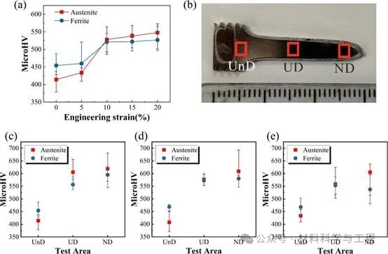 图2. 不同工程应变下以及不同变形区域中奥氏体和铁素体的显微硬度变化