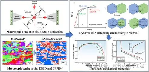 近日,中国科学院金属研究所李殿中院士、王培研究员,联合香港城市大学朱运田教授以及中国科学院高能物理研究所宋温丽副研究员,以奥氏体-铁素体双相钢为模型材料展开研究,揭示了室温单轴拉伸过程中异质区之间独特的强度反转现象。表现出该现象的样品实现了强度与延展性的同步提升。通过多尺度原位力学实验与晶体塑性模拟相结合的方法发现,材料力学性能的改善得益于异质区域间强烈的应变/应力分配,以及由强度反转触发的一种可持续的、动态增强的HDI硬化机制。强度反转使异质区域能够交替承担应变,有效避免了初始软区因过高的局部应变而过早损伤。此外,一旦初始软区的强度超过初始硬区,初始硬区便开始提供背应力。这种异质区域间交替的背应力,确保了HDI硬化能够持续增强而非快速耗尽,进而提高了样品的整体强度。研究还发现,强度反转是否发生以及何时发生,受到初始软区含量、初始软区硬化能力以及异质界面密度的共同影响。相关研究提出了一种新的动态HDI硬化机制,为通过调控各组成相/区的力学属性实现高性能工程材料组织定制提供了新思路。