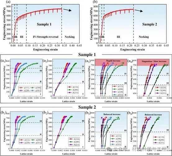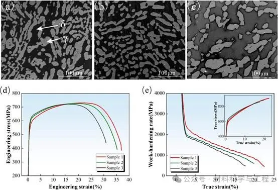 (2) 样品1中较高的奥氏体含量延长了硬化路径,使奥氏体能够经历充分的应变硬化,并在颈缩前表现出显著的强度反转。强度反转后,相间强度梯度引发了超出混合法则预测的额外硬化。相比之下,由于样品2和样品3中奥氏体含量较低,在颈缩前无法实现明显的强度反转。因此,它们在均匀变形阶段缺乏显著的额外硬化,这限制了样品总强度的进一步提高。