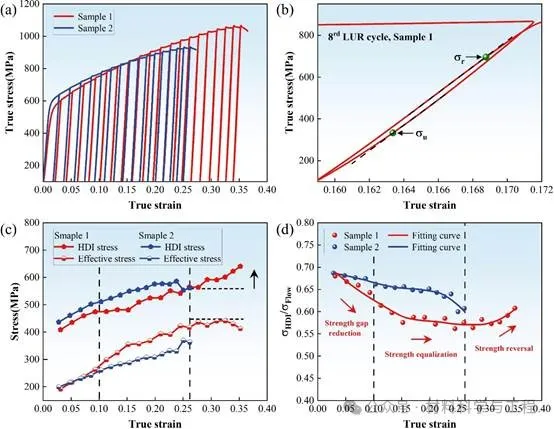 (3) 样品1中由强度反转引起的额外硬化源自一种可持续的、动态增强的HDI硬化效应。强度反转后,较硬的奥氏体和较软的铁素体之间的强度差距随着变形逐渐增大。奥氏体承载正向应力,而铁素体提供背应力硬化,这与反转前的情况相反。值得注意的是,随着强度差距的增大,这种HDI硬化变得更加显著,确保了总应变硬化能力的可持续性,这也是样品1强度提高的关键。