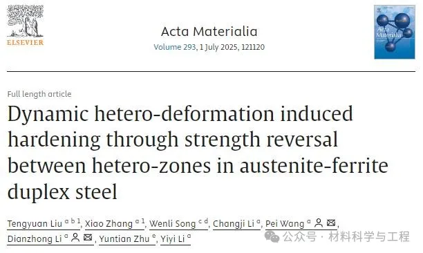相关研究成果以“Dynamic hetero-deformation induced hardening through strength reversal between hetero-zones in austenite-ferrite duplex steel”为题,在线发表于《Acta Materialia》期刊。金属所的刘腾远博士和张潇博士为该论文的共同第一作者,王培研究员和李殿中院士为共同通讯作者。该研究工作获得了国家自然科学基金(52201150,52031013和51931003)的资助。