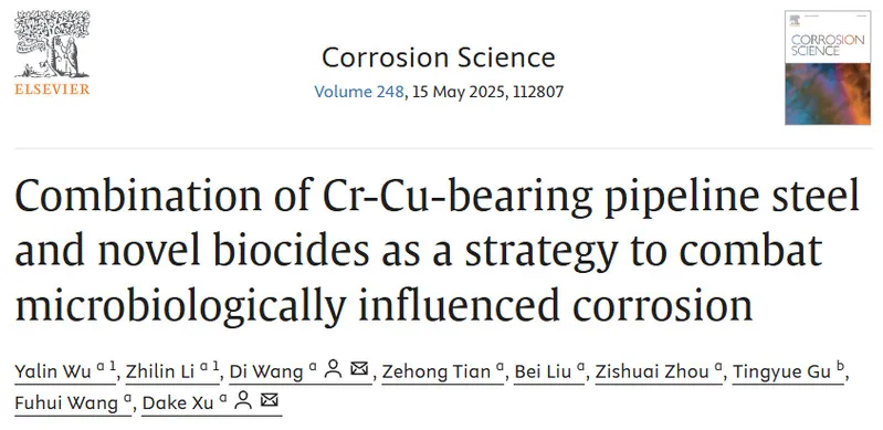 近日,材料学院王福会教授团队徐大可教授课题组本科生在国际腐蚀领域顶级期刊Corrosion Science(中科院一区,影响因子7.4)上发表了题为《Combination of Cr-Cu-bearing pipeline steel and novel biocides as a strategy to combat microbiologically influenced corrosion》的研究论文,材料科学与工程专业2022级本科生吴亚林与李祉霖为共同第一作者,徐大可教授与王迪副教授为共同通讯作者。 管道运输是石油和天然气行业的命脉,也是国家能源安全的生命线。然而,微生物腐蚀已成为威胁管道安全运行的突出问题。为解决传统管线钢在恶劣油气田环境面临的微生物腐蚀问题,本研究提出了一种基于新型耐蚀抗菌含铬含铜管线钢结合绿色环保型杀菌剂复配技术抑制微生物腐蚀的新思路。 本研究通过在传统管线钢中加入铜和铬元素制备出具有显著抗菌和耐腐蚀性能的新型含铬含铜管线钢,有效抑制了细菌在材料表面的黏附。本研究利用松香基硫脲吡啶季铵盐协同纳米银颗粒,组成具有广谱杀菌效果且环保的杀菌剂。通过该环保型杀菌剂与新型含铬含铜管线钢的复配,进一步提高材料耐微生物腐蚀性能,确保管道长期安全运行。 以上研究得到国家杰出青年科学基金、科技部重点研发计划、国家自然科学基金青年科学基金和东北大学大学生创新训练计划项目的支持。