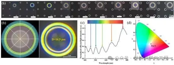该团队通过精密打印技术成功制备了尺寸均一、排列有序、具备单面可见光学特性的微球冠结构。系统研究了基于全内反射(TIR)结构色形成所需的尺寸与角度条件,发现通过调控微球冠结构的尺寸以及基底的润湿性,可实现覆盖全可见光谱的结构色图案。基于这一原理,构建了一种可实现多类型色觉缺陷识别的多功能检测卡,仅通过一个样本即可完成多项诊断。聚丙烯酸墨水在疏水性基底上形成了形貌规整、排列紧密的微球冠结构。从图案背面通过暗场光学显微镜观察不同尺寸的微球冠结构发现,其结构色主要集中在三相接触线附近,以同心环的形式呈现。