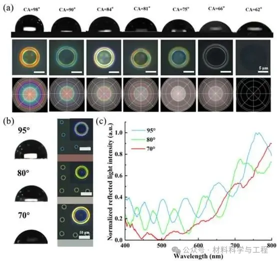 图3. (a) 不同润湿性基底上墨滴的接触角图像、暗场光学显微图像及三维模拟图像;(b) 接触角分别为95°、80°和70°时的墨滴接触角图像及对应的暗场光学显微图像;(c) 不同接触角下微球冠结构产生的结构色的反射光谱