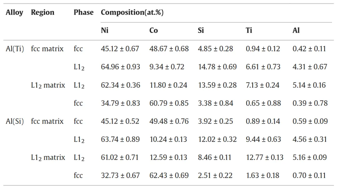 不同Si和Ti含量会因吉布斯自由能变化显著影响合金的相结构,Ti元素更易促进L12有序化。Al(Ti)合金沿晶界形成的fcc型无序纳米层与Al(Si)合金晶界附近的不均匀无序fcc形成对比,前者能有效消除晶间断裂。在变形早期,超晶格位错对剪切fcc纳米颗粒是L12基体区域的主要变形模式,fcc纳米颗粒的反向析出也有显著硬化作用,提高了屈服强度。而在变形后期,由于Al(Ti)合金自身堆垛层错能低且强度极高,SSFs被激活,这种变形结构提高了合金的加工硬化响应和延展性。