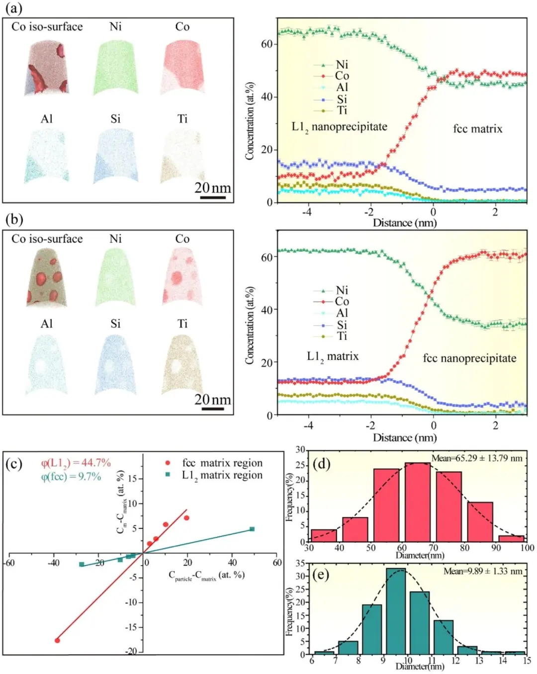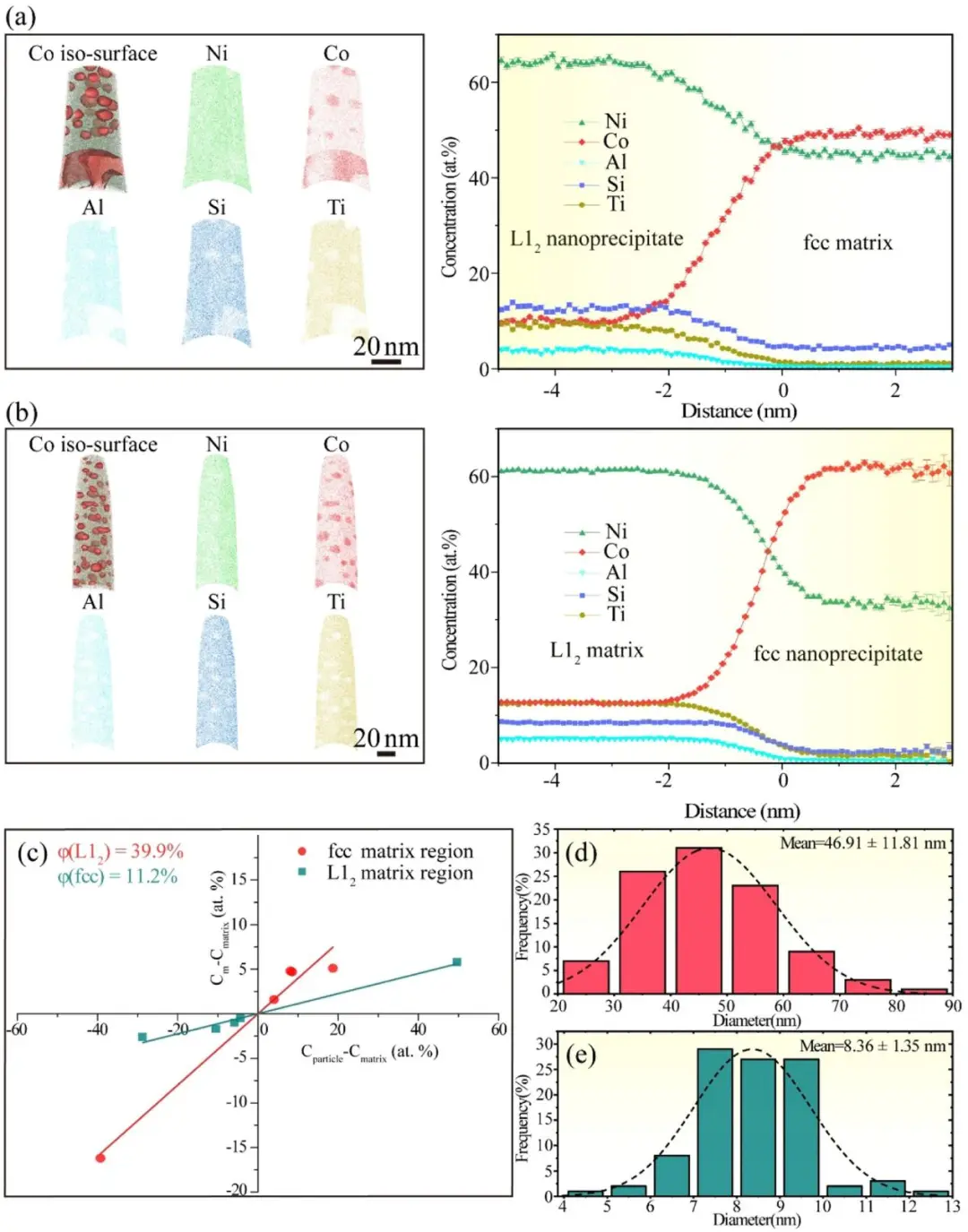 (d)和(e)分别为L12和fcc纳米沉淀物的统计沉淀物直径的直方图。