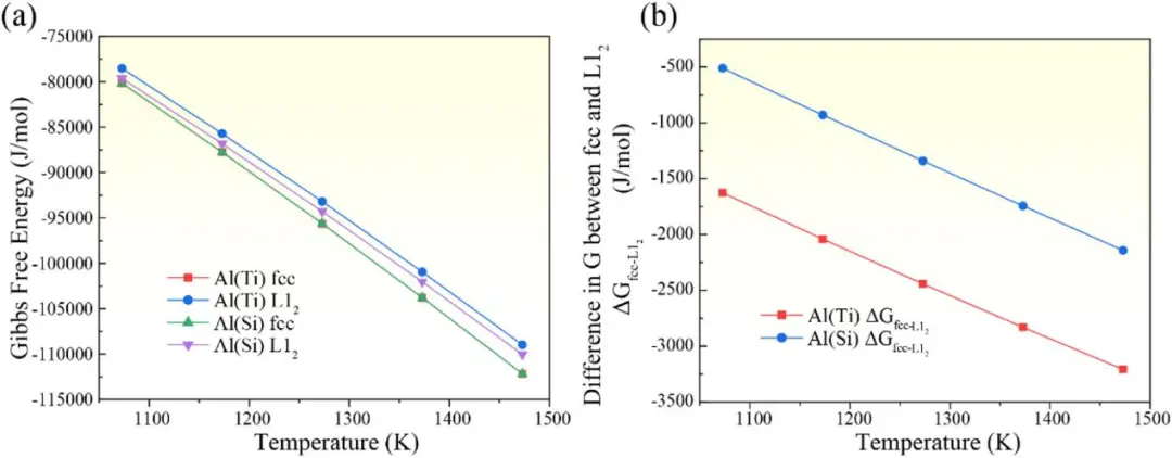 图7 (a)Al(Ti)和Al(Si)合金中fcc和L12相的吉布斯自由能的温度依赖性。