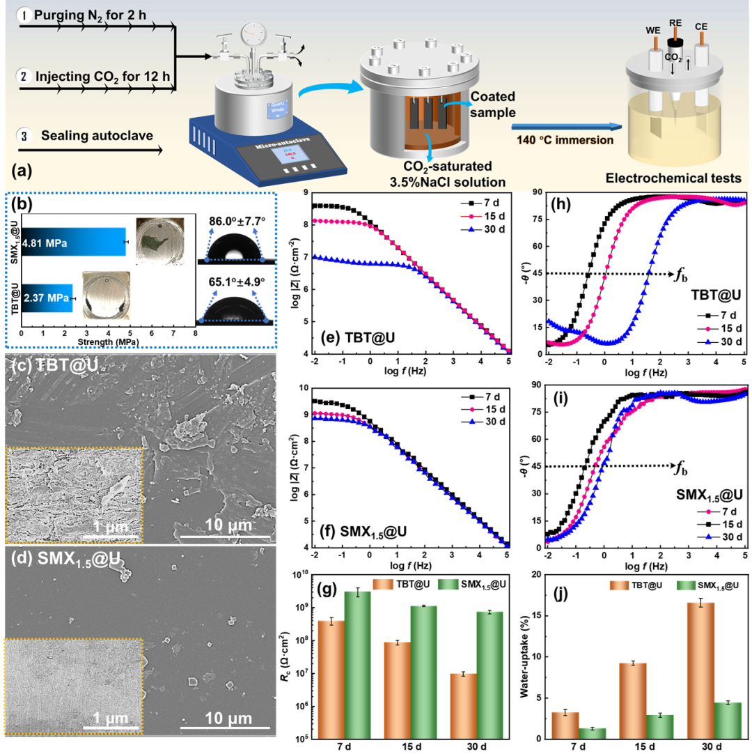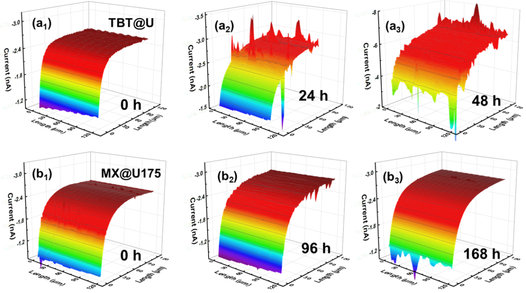 图2. 碱化 Ti3C2Tx 与漆酚分子间的交联机制示意图。 卓越防护效果 优化配比的MXene/漆酚复合涂层在CO2饱和的3.5% NaCl盐水中,140℃高温环境下浸泡30天后仍保持超高阻抗(7.42×108 Ω·cm2),明显优于传统钛有机交联涂层。 图3. (a) 涂层样品在 CO2饱和 3.5% NaCl 溶液中于 140°C 条件下的浸泡测试流程图;(b) SMX1.5@U 与 TBT@U 涂层在高温浸泡30天后的附着力和润湿性比较;(c, d) 两种涂层的表面与截面扫描电镜图像;(e, f) Bode 模量图,(h, i) 相位角图,展示不同浸泡时间下的电化学阻抗行为;(g) 涂层的电荷转移电阻Rc;(j) 涂层的吸水率。 自修复能力 涂层破损时,MXene降解生成的TiO2和无定形碳沉积于缺陷处,且酒石酸钠释放的还原分子可吸附在钢材表面,实现破损局部自我修复,延长涂层寿命。提出了使用扫描电化学显微镜(SECM)研究自愈机理 图4. 涂层划痕区域在不同浸泡时间下的SECM电流分布图:(a1-a3) TBT@U 涂层划痕在不同时间后的电流响应;(b1-b3) SMX1.5@U涂层划痕在不同时间后的电流响应。 应用价值与展望 该研究成功展示了利用天然漆酚与功能化MXene纳米材料构建环保、高效、耐高温的防护涂层新策略,为重稠油高温高腐蚀场景下的管道防护提供了有力技术支持。未来,该类复合涂层有望在石油、化工等能源领域广泛推广,助力我国实现重稠油安全高效开采与运输。 研究团队认为,ST稳定的Ti3C2Tx纳米片碱化处理后可高效交联漆酚,构建具优异耐热性与自修复能力的防腐涂层,适用于极端油气环境。 北京工商大学2022级硕士研究生李航作为该工作的主要完成人,完成了相关实验设计与研究分析。特别感谢国家自然科学基金和北京市自然科学基金对本研究的资助。同时,也感谢中国石油工程建设有限公司北京设计分公司提供的资金支持与技术协助。