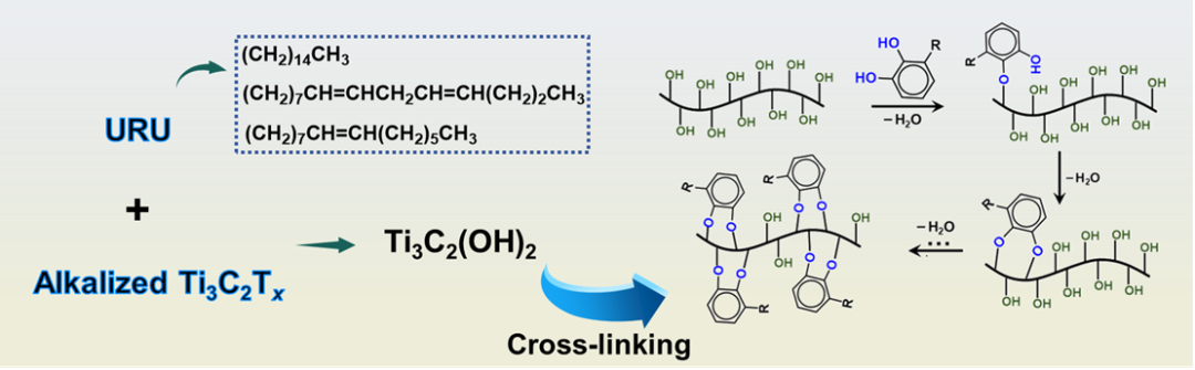 利用酒石酸钠有效稳定了MXene纳米片的胶体分散状态,同时通过碱化过程在其表面引入丰富的羟基,成为漆酚分子交联的活性位点,无挥发性有机物排放,实现绿色环保交联。