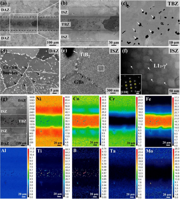图2 具有梯度结构“DAZ/ISZ/TBZ/ISZ/DAZ”的接头组织形貌,包括原位析出的微米级晶内TiB2 硼化物以及有序共格的L12 纳米颗粒
