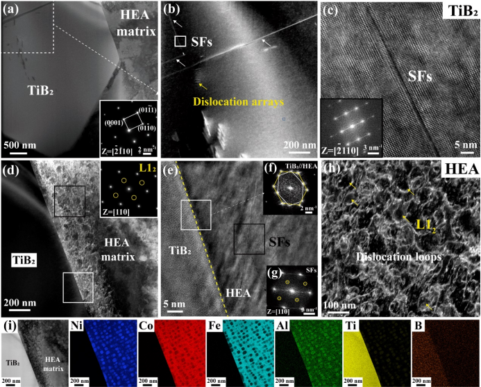 图5 高温800°C下接头的微观变形组织,包括硼化物内部的堆垛层错,TiB2/HEA半共格界面以及HEA内部的的位错形貌