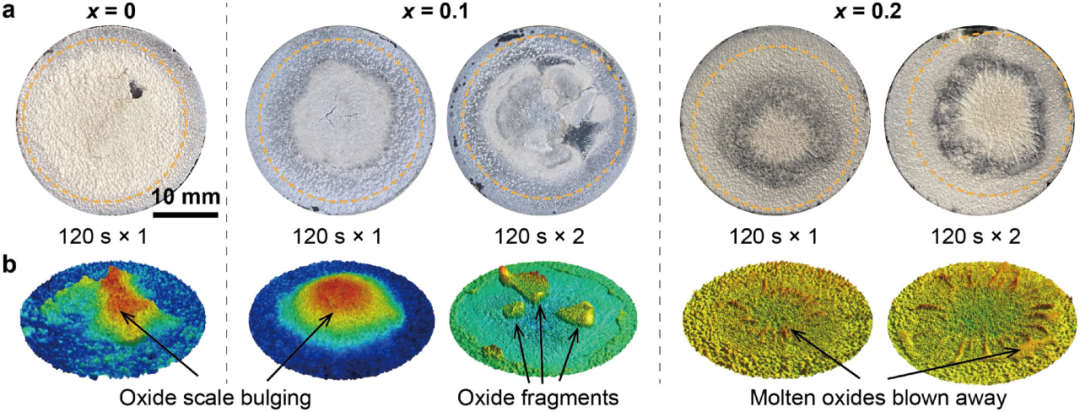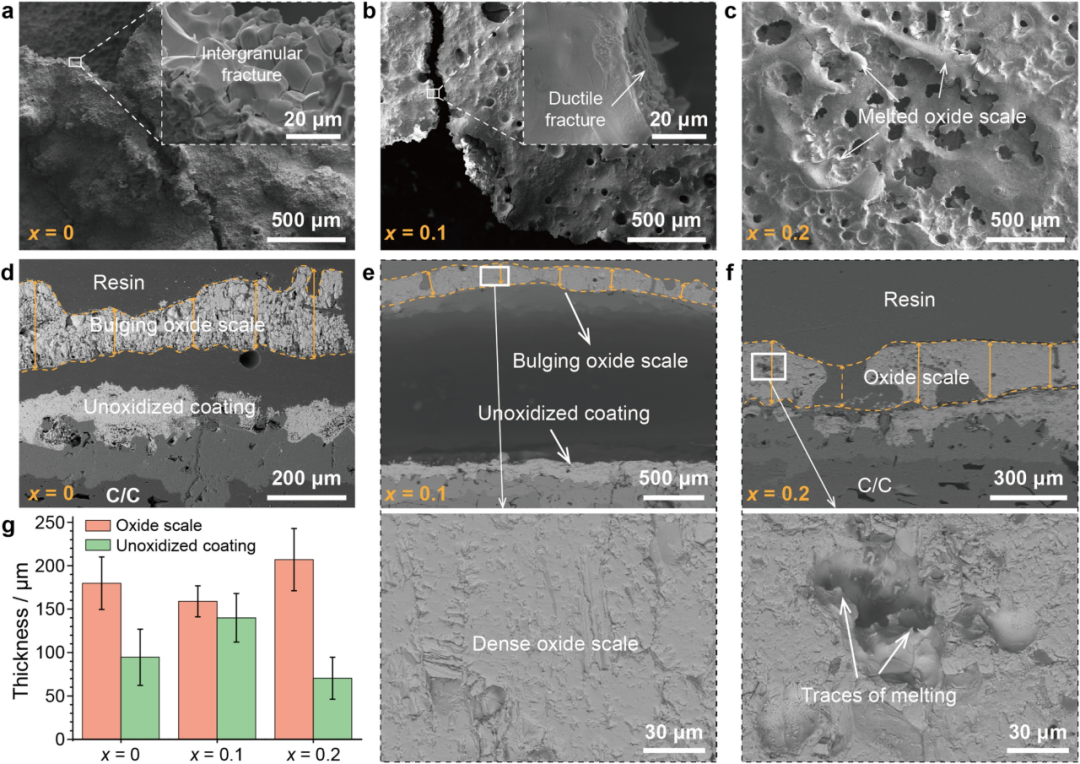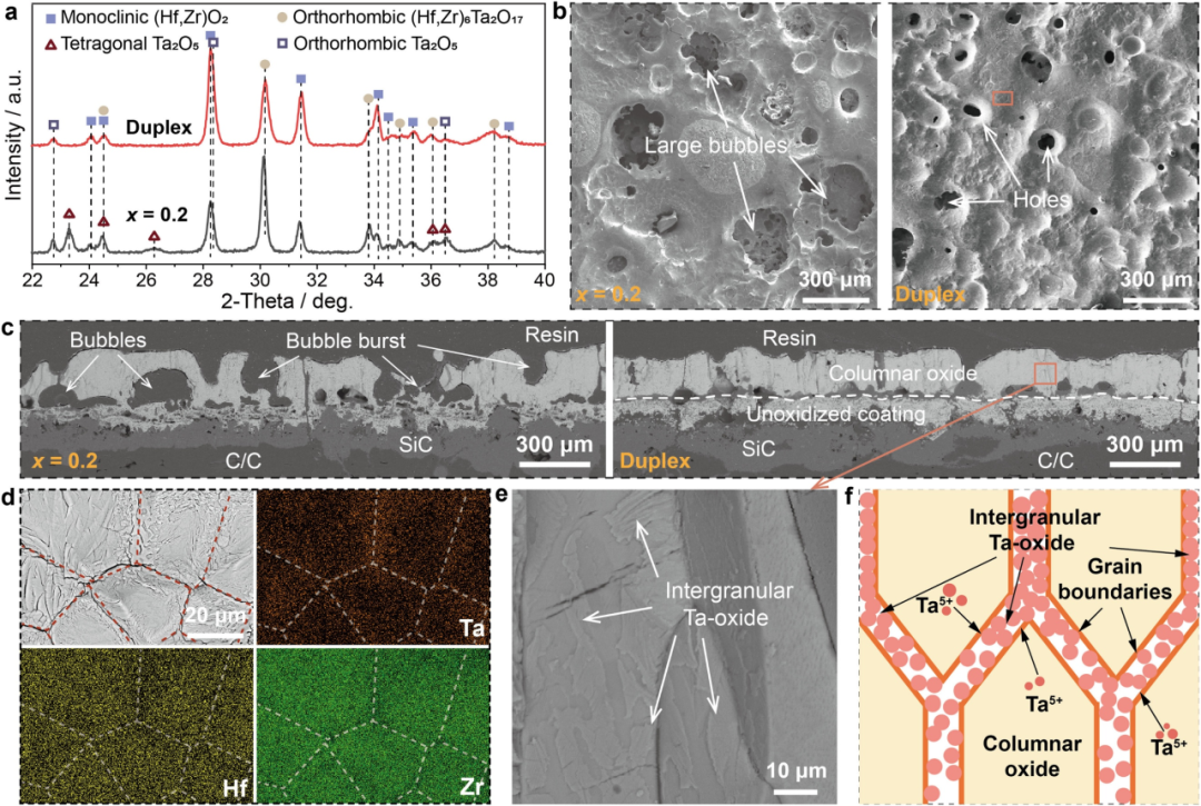通讯作者:张雨雷,李涛 通讯单位:西北工业大学,河南省科学院 DOI: 10.1016/j.jmst.2024.03.050 01 全文速览 针对C/C复合材料在超高温环境下耐烧蚀性能不足的问题,本文作者设计并制备了多组元(Hf-Zr-Ta)B2陶瓷涂层,通过成分调控及结构优化,显著提升了涂层的抗烧蚀能力。研究系统揭示了烧蚀过程中氧化膜的关键相变行为及其对涂层性能的影响,为高温结构材料表面防护提供了新的设计思路。相关成果以“Multicomponent (Hf-Zr-Ta)B2 coatings for carbon/carbon composites and structural optimization enabling superior ablation resistance”为题,发表在Journal of Materials Science & Technology。 02 研究背景 在高速飞行器极端应用环境中,飞行器表面热防护部件需承受超过2000°C的强气动加热和复杂氧化烧蚀环境,这对材料提出了极为苛刻的热-力-化学多场耦合服役要求。碳/碳(C/C)复合材料因其优异的高温力学性能和抗热震性,被视为此类极端环境应用的最佳候选材料之一。然而,C/C复合材料易于高温富氧环境中发生氧化损伤,导致结构退化,力学性能大幅衰减。因此,为C/C复合材料构建高效的表面氧化烧蚀防护涂层是提升其可靠性与寿命的关键。 传统硅基及其改性涂层凭借在中高温区间良好的抗氧化性,得到了较为广泛的应用。其保护机理主要依赖于氧化生成的难熔过渡金属氧化物-SiO2复合防护层阻止氧气向内扩散。然而,SiO2在超过2000°C的超高温环境下出现熔化、蒸发等现象,导致防护层破坏,限制了硅基涂层在更高服役温度下的应用。为解决上述问题,研究者们转向了超高温陶瓷(UHTCs)涂层体系的开发。以HfB2、ZrB2等为代表的二硼化物,因其高熔点(>3000°C)、良好的热导率和优异的抗氧化潜力,成为重要研究对象。近期,多组元UHTCs体系(特别是含Ta的固溶体)受到高度关注。合理引入Ta元素有望改善氧化产物的热稳定性,避免形成大量的易挥发或软化的低熔点相,从而提升烧蚀防护涂层在极端环境下的耐久性。 然而,当前关于多组元(Hf-Zr-Ta)B2涂层的研究相对有限,尤其是针对Ta含量变化对烧蚀行为的系统性认识尚不充分。此外,如何通过成分与结构的协同优化来提升涂层的抗氧化性也是亟待解决的重要科学问题。因此,本文作者系统设计并制备了多组元(Hf-Zr-Ta)B2涂层,并通过成分调控与双层结构优化,实现了涂层性能提升;结合多尺度表征手段,揭示了其在超高温烧蚀环境中的防护机制与结构演变机理,为未来超高温结构材料的表面防护提供新思路与技术支撑。 03 本文亮点 采用超音速等离子喷涂技术制备了多组元(Hf-Zr-Ta)B2陶瓷涂层,提出了Ta含量调控与结构优化相结合的新策略。所制备的双层(Hf-Zr-Ta)B2涂层在两次120秒烧蚀测试后表现出近乎“零”线性衰退率(0.11 μm/s),通过系统的多尺度结构表征,阐明了烧蚀过程中的元素迁移规律与界面演变特征,揭示了超高温下(Hf,Zr)6Ta2O17向(Hf,Zr,Ta)O2及富Ta液相的包晶转变机制在氧化膜致密化和烧蚀防护中的作用,为多组元UHTC体系在极端环境应用提供了新的设计依据。 04 图文解析 ① (Hf-Zr-Ta)B2单层涂层烧蚀行为与氧化膜结构稳定性对比 图1展示了具有不同Ta含量的三种涂层(x = 0, 0.1, 0.2)在氧乙炔焰(2.4 MW/m2)下经120秒与240秒烧蚀后的表面形貌与三维形貌图。可以发现,x = 0和x = 0.1样品在首次烧蚀后氧化层鼓起,第二次烧蚀后发生破裂与剥落,而x = 0.2样品在两轮烧蚀后表面氧化物表现出明显的流动痕迹,这表明过多的Ta含量会降低氧化层的热稳定性。 图1 氧乙炔烧蚀测试后(Hf0.5–x/2Zr0.5–x/2Tax)B2涂层:(a)光学照片;(b)三维形貌图 涂层经120秒烧蚀后的表面与截面微观结构及氧化层&残余涂层厚度如图2所示。x = 0和0.1涂层氧化层鼓泡严重并发生脱层,这是由氧化产物从四方到单斜的相变产生的体积变化引起;而x = 0.2样品由于氧化层较好的粘附性与基底保持良好结合,但氧化层出现严重熔蚀与孔隙。氧化层微观结构揭示其热稳定性受相变诱发应力和氧化物粘结状态共同影响。三种涂层的氧化层&残余涂层厚度对比表明x = 0.1涂层具有更薄的氧化层厚度,说明其较强的阻挡氧气向内部扩散的能力。 图2 (Hf0.5–x/2Zr0.5–x/2Tax)B2涂层测试120秒后的形貌演变与氧化层&残余涂层厚度对比:(a,d)x = 0;(b,e)x = 0.1;(c,f)x = 0.2;(g)氧化层&残余涂层厚度对比 ② 涂层分层结构设计优势与防护机制 基于以上结果,如图3所示,对涂层结构进行优化:构筑了由x = 0.1阻氧层与x = 0.2粘接层共同组成的双层涂层。所构建的双层涂层在双120秒循环烧蚀中表现出极低线性衰退率(0.11 μm/s),优于报道的多数同类体系。 图3 双层(Hf-Zr-Ta)B2涂层微观结构、元素分布与烧蚀性能:(a)结构示意图;(b)截面SEM图像;(c)截面元素分布;(d)表面响应温度曲线;(e)涂层抗烧蚀性能对比 图4对比了x = 0.2单层涂层与双层涂层在两轮120秒烧蚀后氧化层的相组成以及表面和截面形貌。x = 0.2氧化层表现出高度熔化的迹象,大量气体氧化产物逸出,因此形成了大尺寸的孔洞;双层涂层的氧化层由柱状氧化层组成,结构较为完整,并且未被完全消耗,说明双层设计在保证氧化层结构完整性的同时增强了其阻氧性能。另外,从图4d,e中可以观察到富Ta氧化物在晶界处的析出,这与烧蚀过程中(Hf,Zr)6Ta2O17的包晶转变相关,少量的液相存在不仅能够促进氧化层的烧结还能够愈合涂层中的缺陷。 图4 分层与单层涂层烧蚀后的氧化层结构对比与Ta氧化物分布特征:(a)表面XRD图谱