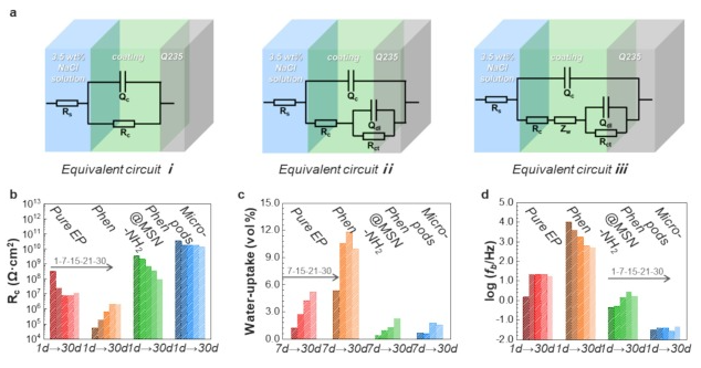 受豆荚启发的微容器(micropod)由高容量中空介孔二氧化硅纳米颗粒/氧化石墨烯(MSN-NH2/GO微容器)和指示剂及抑制剂1,10-菲罗啉(Phen)组成。微模块的pH响应性来自于GO静电阀与 MSN-NH2的相互作用,在不同的pH值下,MSN-NH2的表面电荷会发生变化,从而控制 Phen的释放。当随着pH值的升高发生涂层下腐蚀时,Phen从脱离的微柱中逸出,与溶解的Fe2+配位,呈现出橘红色,并形成被动的络合物膜阻止腐蚀,从而实现腐蚀感应和抑制。同时,GO的高宽比延长了腐蚀性介质在涂层中的扩散途径,从而增强了涂层的耐腐蚀性。Phen@micropod/epoxy防腐涂层在浸泡试验和盐雾试验中表现良好,在30天浸泡试验中保持完好,其Rc值是纯环氧涂层的1000倍。