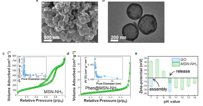 a)SEM图像和 b)MSN-NH2的TEM图像、N2吸附-解吸等温线和 c)MSN-NH2的孔分布曲线,d)Phen@MSN-NH2和e)不同pH值下水溶液中MSN-NH2和GO的Zeta电位