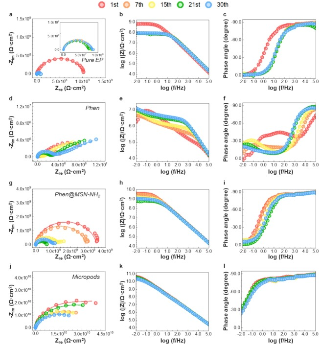a) 完整的纯 EP 涂层的奈奎斯特图和 b、c) Bode 图;d) Phen/EP 涂层的奈奎斯特图和 e、f) Bode 图;g) Phen@MSN-NH2/EP涂层的奈奎斯特图和 h、i) Bode 图;j) 浸泡在3.5wt% NaCl溶液中的填充微柱/EP涂层的奈奎斯特图和 k、l) Bode 图