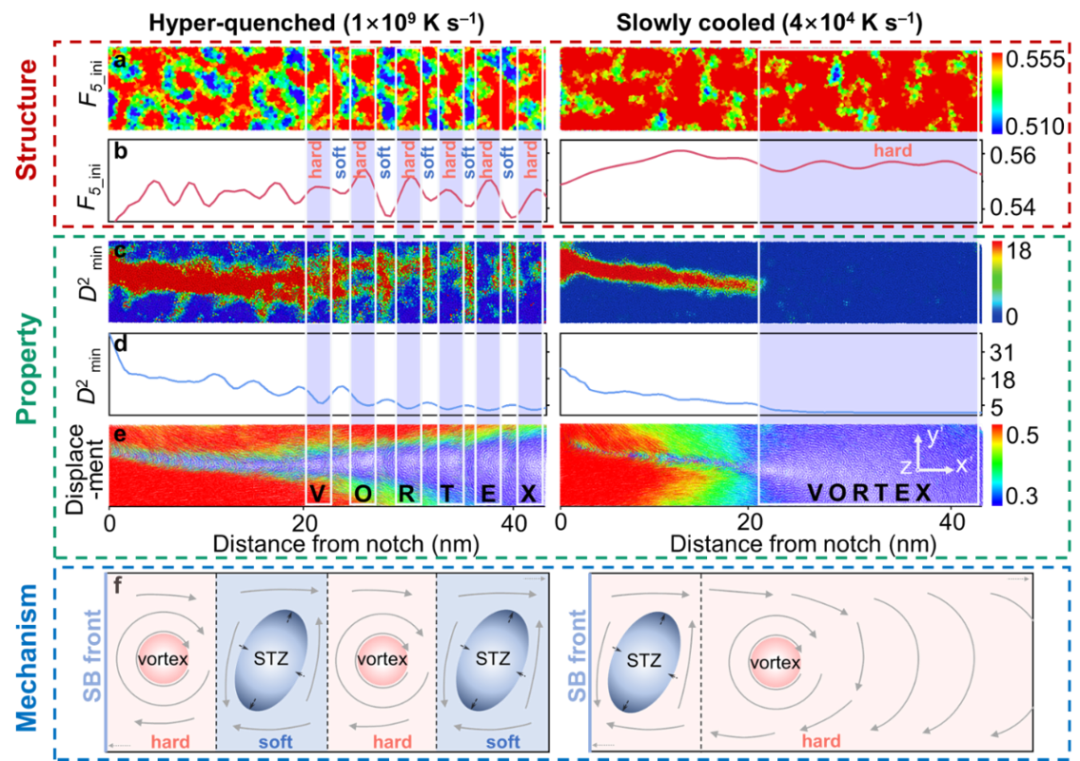 该研究首次从原子层面揭示了结构状态对剪切带传播机制的决定性作用。这些发现为非晶合金中剪切带的初始形成与传播的微观动力学提供了全新见解,强调了如何通过调节金属玻璃结构状态来控制剪切带行为。这为优化非晶合金的机械性能以满足特定工程应用需求带来了新的机遇。