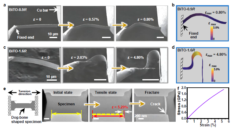 在力学性能方面,未进行构型熵设计的Bi4Ti3O12薄膜在微小的弯曲载荷下会立即断裂,随着熵值的增加,具有一定非晶含量的中熵薄膜(Bi2La0.5Nd0.5Pr0.5Sm0.5Ti3O12)可发生一定的弯曲形变,最大弯曲应变为0.8%,而自支撑的Bi1La0.75Nd0.75Pr0.75Sm0.75Ti3O12高熵氧化物薄膜在180°对折后仍未出现断裂,最大弯曲应变达4.8%,进一步对其进行原位拉伸测试表明,其拉伸断裂伸长率可达5.29%。此外,该高熵氧化物薄膜具有快速弯曲回复性能和耐疲劳弯曲性能,展现出优异的柔韧性(图2)。