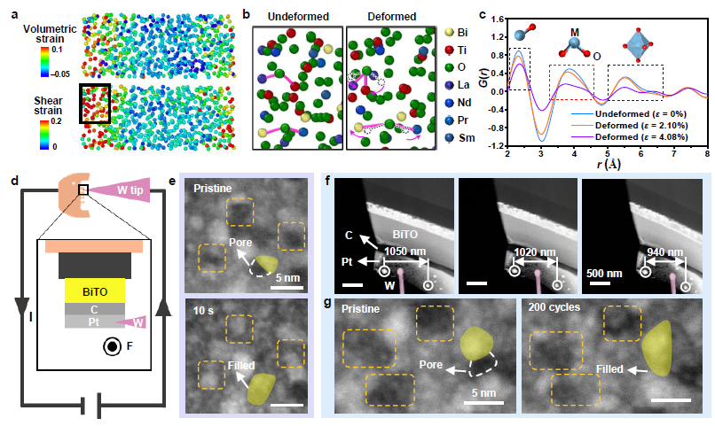 随后,从微观结构演变层面阐明了高熵氧化物陶瓷薄膜柔韧性的根本原因(图3)。通过第一性原理分子动力学(AIMD)对高熵非晶模型在不同拉伸应变下的结构演变进行分析,结果表明随着应变增加,观察到了明显的体积应变和剪切应变的增加,说明其内部键长键角发生变化。同时,对原位拉伸过程中采集的旋进电子衍射(PED)数据进行详细分析,获得的对分布函数G(r)揭示了应变作用下键长的变化与键的旋转。此外,扫描透射电子显微镜(STEM)下的原位力学/电学测试结果表明,纳米晶的压电效应使其在外力作用下发生一定程度的迁移,填充至易发生应力集中的孔洞等缺陷处,从而缓解应力集中并可能导致裂纹偏转,这种“缺陷愈合”机制是传统功能陶瓷所不具备的。