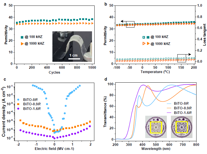 在功能性方面,柔性高熵氧化物薄膜中的纳米晶结构使其保留了本征功能特性(图4):介电常数约为35,优于绝大多数聚合物和有机/无机复合介电薄膜,而且在−100°C至200°C的宽范围内保持稳定,使其在极端条件下展现出应用潜力;同时优异的柔韧性使其在1000次循环后介电常数变化小于2.4%,展现出良好的耐用性。更重要的是,与低熵和中熵的陶瓷薄膜相比,高熵氧化物薄膜具有更低的漏电流密度,证明其绝缘性能得到了明显提升,这主要是因为其稳定的高熵无定形结构带来的,这种绝缘性可大幅提升其在介电储能中的击穿场强,进而提升其储能密度。此外,高熵氧化物薄膜具有较高的透过率,在光学领域展现出一定的应用前景。