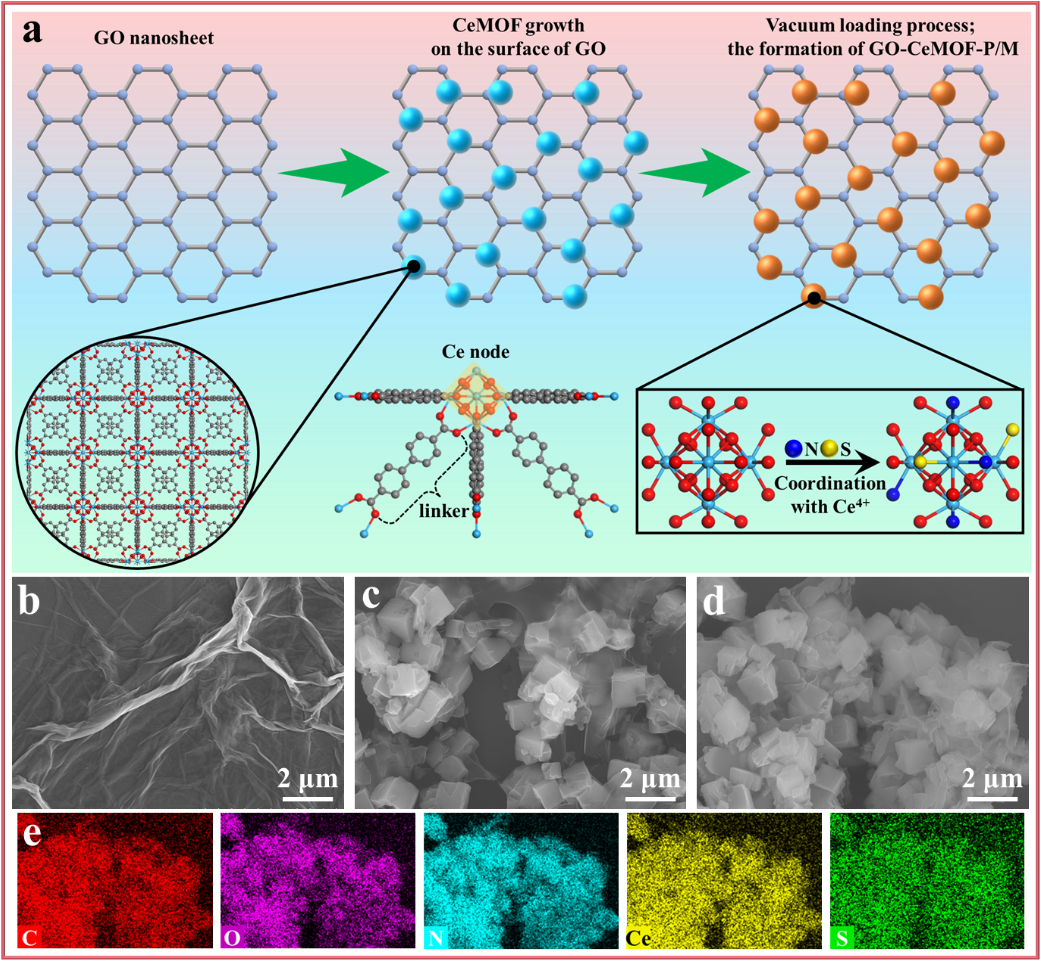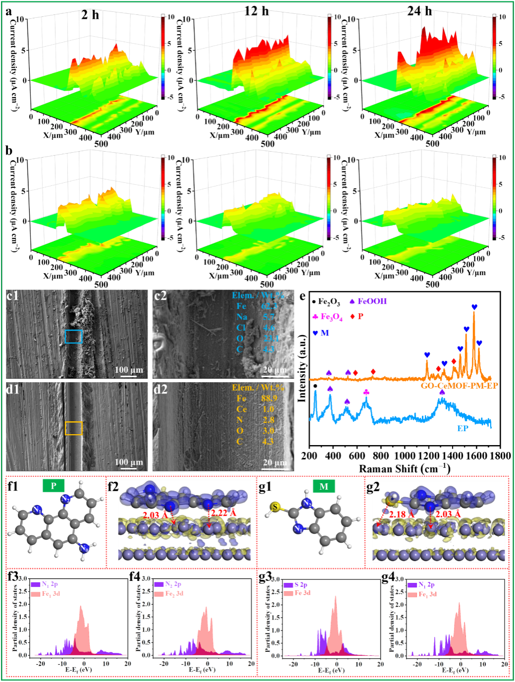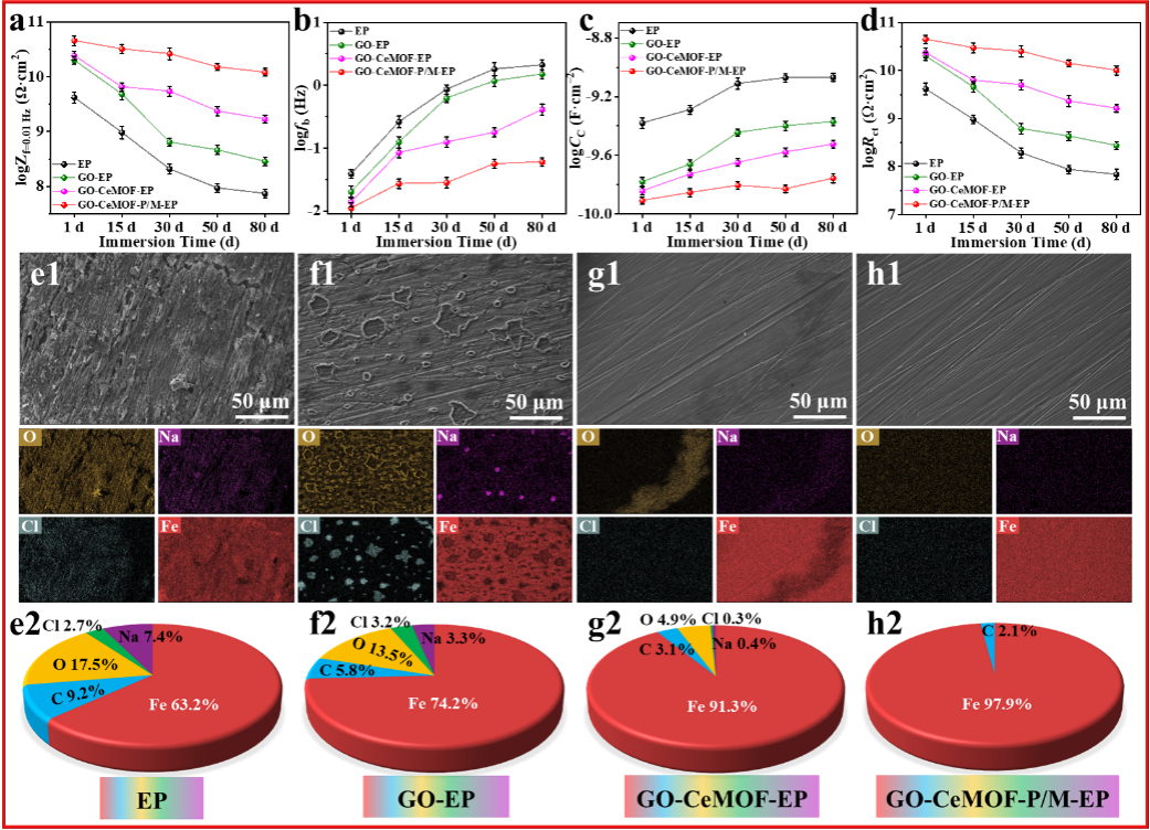 01 全文速览 本研究设计了一种氧化石墨烯/铈基金属有机框架多尺度结构并实现了双功能化负载(GO-CeMOF-P/M),以此为基础构筑海洋防护涂层。GO-CeMOF-P/M均匀分散与基体的协同作用显著提升了涂层的致密性和力学性能,同时具备环境响应与主动防护能力,使涂层具有优异的稳定性与智能防护效果。经80天模拟海水浸泡后,复合涂层低频阻抗模值达1.2×10¹⁰ Ω·cm²,较纯环氧涂层(7.3×10⁷ Ω·cm²)提升164.4倍,展现出可靠的长效防护性能。 02 研究背景 海洋资源的高效开发是国家海洋经济可持续发展的战略支柱,而海工装备与船舶在复杂环境下的长周期稳定服役则是实现这一目标的关键保障。据权威研究显示,我国每年因海洋腐蚀造成的直接经济损失超过万亿元,占GDP总量的1.1%。有机防护涂层是抑制金属电化学腐蚀最有效的手段。然而,在长期服役过程中,涂层内部逐步产生微孔与裂纹,导致其服役寿命下降。因此,突破传统涂层在缺陷耐受性与损伤容限方面的瓶颈,研发兼具长期阻隔性能与智能响应能力的新型防护涂层体系,已成为当前海洋材料防腐领域面临的重要科学挑战。 03 本文亮点 (1)构建了一种功能化多尺度纳米复合材料,用于制备兼具智能特性的长效防护涂层。 (2)复合涂层具有机械增强、自报告和主动防护功能,实现了多维度协同防腐性能提升。 (3)结合实验测试与第一性原理(DFT)计算,揭示了涂层多功能协同防护的微观作用机制。 04 图文解析 基于两步法制备GO-CeMOF-P/M复合纳米材料:首先利用有机配体在氧化石墨烯纳米片表面进行锚定吸附;随后引入Ce⁴⁺离子,通过金属-配体配位作用实现CeMOF在GO表面上的原位可控生长;最终在真空环境下将5-氨基-1,10-菲咯啉(P,自报告剂)和2-巯基苯并咪唑(M,缓蚀剂)双重功能分子负载至CeMOF孔道,从而获得GO-CeMOF-P/M复合材料。CeMOF晶体作为"结构铆钉"有效抑制了GO的团聚。 图1(a)GO-CeMOF-P/M复合材料制备示意图。(b)GO,(c)GO-CeMOF,(d)GO-CeMOF-P/M的SEM图像。(e)GO-CeMOF-P/M的元素分布图。 由于界面强化、交联密度提升,以及复合材料中含氧/氮官能团与钢基体间的配位协同效应,导致GO-CeMOF-P/M-EP涂层的结合力显著提高。此外,复合涂层的抗拉强度和延展性得到了同步改善,其增强机制可从三方面阐释:(1)均匀分散的GO-CeMOF-P/M作为"桥梁"强化层间/层内氢键,实现高效应力传递;(2)P/M分子的氨基/杂原子与CeMOF的丰富羰基共同构建氢键网络;(3)GO-CeMOF-P/M部分替代多胺固化剂参与环氧链交联反应。 图2(a)不同涂层的附着力和(b)应力应变曲线。(c)EP、(d)GO-EP、(e)GO-CeMOF-EP和(f)GO-CeMOF-P/M-EP涂层拉伸后的断裂形貌。 基于扫描振动电极技术(SVET)对 GO-CeMOF-P/M-EP涂层的主动防护性能进行量化评估。结果显示,GO-CeMOF-P/M-EP涂层的电流密度峰值在浸泡过程中下降且无扩散现象,表明其具备持续可靠的主动防护能力。SEM/EDS与Raman分析表明,该性能源于复合材料中P和M分子在环境刺激下的可控释放,这些分子在钢基体表面吸附形成致密保护膜,有效阻隔腐蚀介质。DFT计算进一步从电子尺度揭示机制:P/M分子中N、S杂原子的2p轨道与Fe(110)晶面的3d轨道发生轨道杂化,引发显著的电荷转移,从而强化了分子与金属界面的化学吸附作用。这种原子尺度的界面相互作用机制,最终阐释了GO-CeMOF-P/M-EP涂层卓越主动防护性能的微观驱动力。 图3引入划痕后(a)EP和(b)GO-CeMOF-P/M-EP涂层浸泡24小时的SVET电流密度图。剥离(c)EP和(d)GO-CeMOF-P/M-EP涂层后,划痕附近区域的腐蚀形貌。(e) EP和GO-CeMOF-P/M-EP涂层划痕附近的拉曼光谱。(f1-f4)M和(g1-g4)P分子的几何优化构型和吸附在Fe(110)晶面上的EDD和PDOS。 水溶液显色反应评估表明,GO-CeMOF-P/M纳米复合材料与Fe²⁺存在特异性比色响应:初始淡黄色上清液加入0.5 mL Fe²⁺溶液(10⁻⁵ M)后迅速转变为浅粉色,且显色强度随Fe²⁺浓度增加呈梯度增强。划伤的GO-CeMOF-P/M-EP涂层在30分钟内即出现亮红色信号,该现象归因于P分子与Fe²⁺的快速络合显色。这种早期可视化机制源于阳极溶解产生的Fe²⁺与P分子的强配位作用,使纳米复合材料可作为探针精准追踪腐蚀起始位点,为维护修复提供关键预警指标,从而在严重损坏之前及时进行维护和修复。 图4(a)加入0.5 mL不同浓度的Fe²⁺溶液后,2 mg/mL GO-CeMOF-P/M水溶液的颜色变化。(b)纯EP(灰色)和GO-CeMOF-P/M-EP(红色)涂层损伤后24小时内中性盐雾试验的光学图像。(c) GO-CeMOF-P/M-EP涂层的自报告机理。 在模拟海水溶液中浸泡80天后,GO-CeMOF-P/M-EP涂层的Zf=0.01 Hz值为1.21×1010 Ω·cm2,较EP涂层(7.38×107 Ω·cm2)高出164.4倍。此外,GO-CeMOF-P/M-EP涂层保护下的金属基体表面未检测到腐蚀产物或氯、氧等元素渗透,进一步了佐证涂层有效阻断了金属/腐蚀介质的电化学相互作用。 图5不同涂层在3.5 wt.% NaCl溶液中浸泡80 d的(a)logZf=0.01 Hz,(b)logfb,(c)logCc和(d)logRct。剥离(e)EP、(f)GO-EP、(g)GO-CeMOF-EP和(h)GO-CeMOF-P/M-EP涂层后钢表面形貌和元素分布。 05 总结与展望 本研究巧妙设计了一种功能化多尺度纳米复合材料,成功制备出兼具机械增强、自报告与主动防护功能的智能环氧涂层(GO-CeMOF-P/M-EP)。GO-CeMOF-P/M在环氧涂层中的均匀分散及其表面官能团与聚合物间的化学相互作用显著提升了涂层的交联密度与致密性。同时,GO-CeMOF-P/M实现了智能响应释放有机/无机缓蚀剂,从而赋予缺陷区卓越的主动防护性能。此外,依托Fe²⁺与P分子的特异性显色反应可实现涂层缺陷可视化自