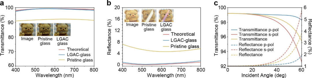 图4. 不同样品的 (a) 透过率、(b)反射率光谱。(c) 不同光线入射角下的透过率与反射率。
