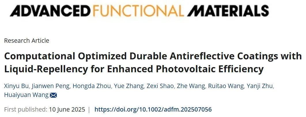 2025年6月10日,相关工作近期以“Computational Optimized Durable Anti-Reflective Coatings with Liquid-Repellency for Enhanced Photovoltaic Efficiency”为题发表在《Advanced Functional Materials》。天津大学化工学院博士生卜鑫瑜为论文第一作者,通讯作者为天津大学化工学院汪怀远教授。