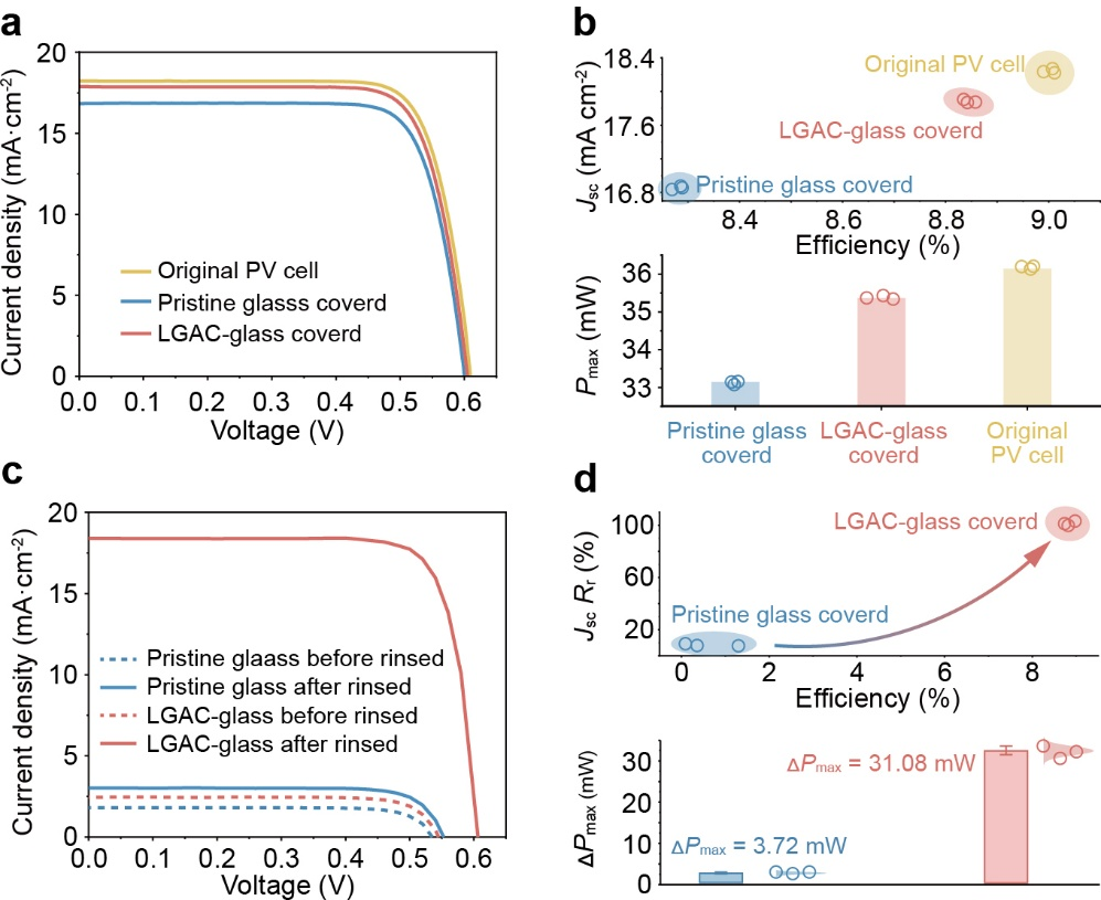 图6. 不同光伏电池的 (a) J-V曲线、(b)光电转换效率和最大输出功率。LGAC-玻璃覆盖的光伏电池和原始玻璃覆盖的光伏电池在自清洁测试前后的 (c) J-V曲线和 (d) 光电转换性能恢复率。