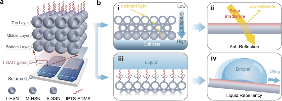 图1. (a) LGAC的分层结构示意图,其中T-HSN和M-HSN分别代表顶层和中层的空心二氧化硅纳米颗粒,B-SSN代表底层的实心二氧化硅纳米颗粒。(b) LGAC抗反射和自清洁性能的机制示意图。