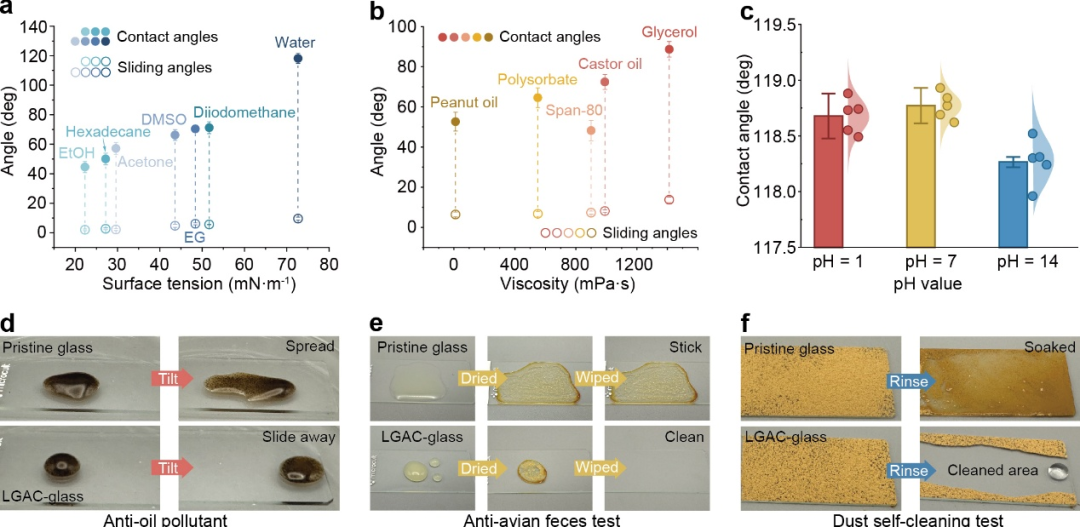 图5. (a) 不同表面张力液体和 (b) 不同粘度液体在涂层表面的接触角和滑动角。(c) 不同pH液体在涂层表面的接触角。涂层对于 (d) 油污、(e) 鸟粪和 (f) 颗粒污染物的防污自清洁性能。