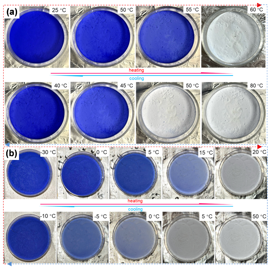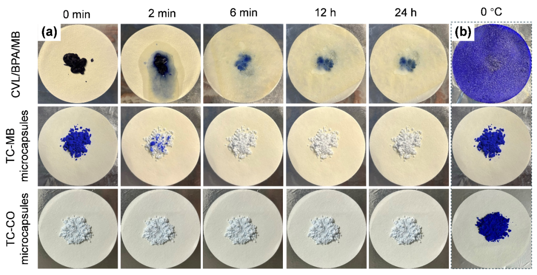 图 9.加热和冷却过程中不同温度下 (a) TC-MB 和 (b) TC-CO 微胶囊的光学图像