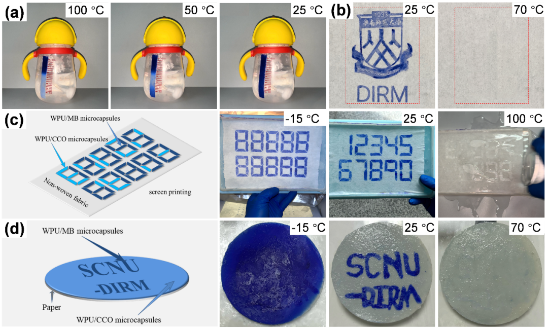 图 11.TC-PCM 涂层在温度指示器、信息加密和防伪方面的应用。(a) 带有 TC-MB 涂层的婴儿奶瓶,里面装满了不同温度的水。(b) 通过丝网印刷在无纺布上涂有 TC-MB 涂层的“SCNU”标志和“DIRM”图案。(c) 无纺布上的 0-9 数字和 (d) 带有 TC-MB 和 TC-CO 涂层的纸上的“SCNU-DRIM”字符。