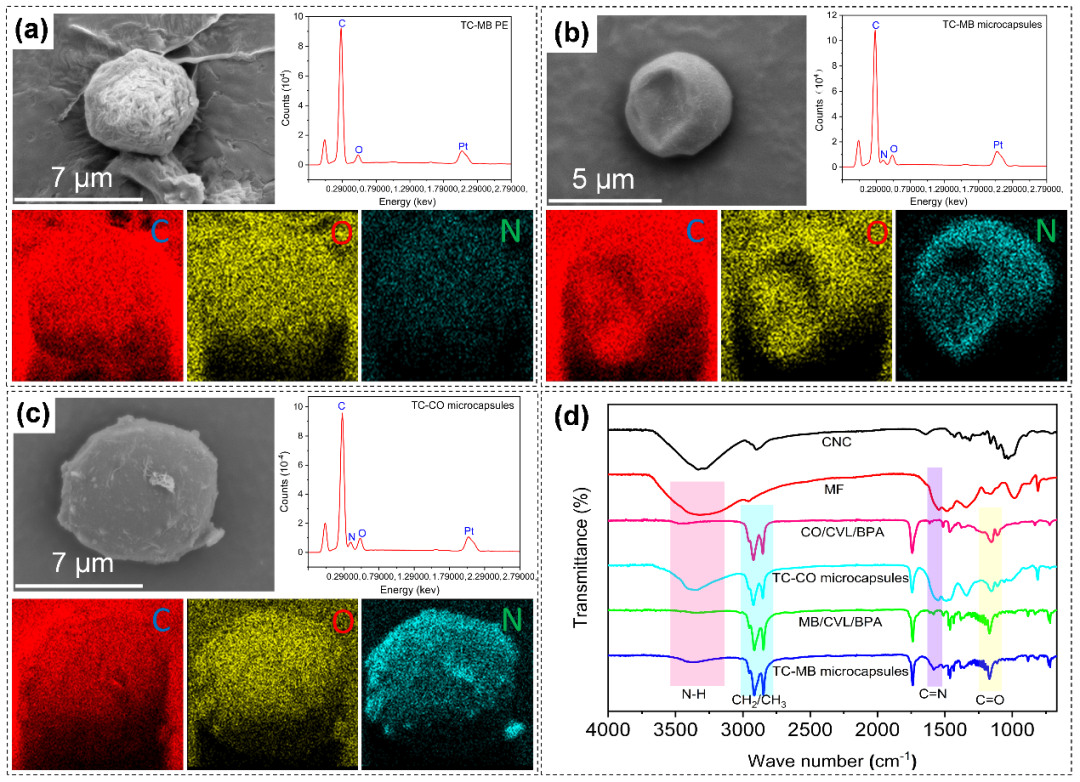 图 4.(a) TC-MB PE、(b) TC-MB 微胶囊和 (c) TC-CO 微胶囊的SEM、元素含量和元素分布图像。(d) FTIR 光谱。