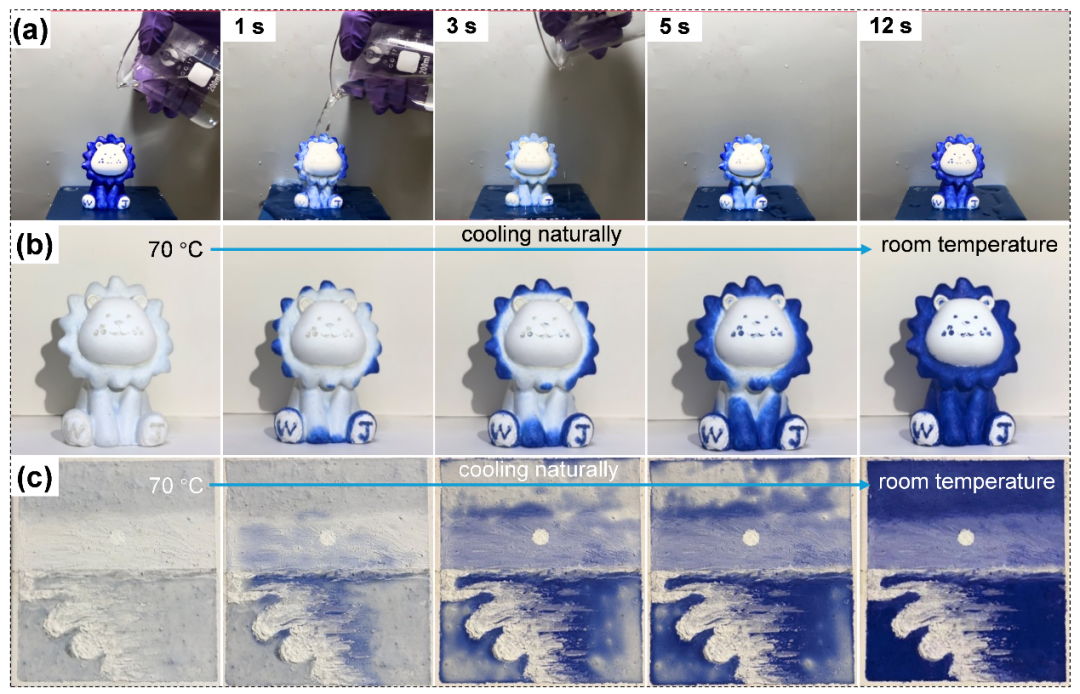 图10. 涂有 TC-MB 涂层的石膏娃娃的颜色变化 (a) 用沸水倒入时和,(b) 从 70 °C 自然冷却至室温。 (c)从 70 °C 自然冷却至室温时涂有 TC-MB 涂层的海滨画像。