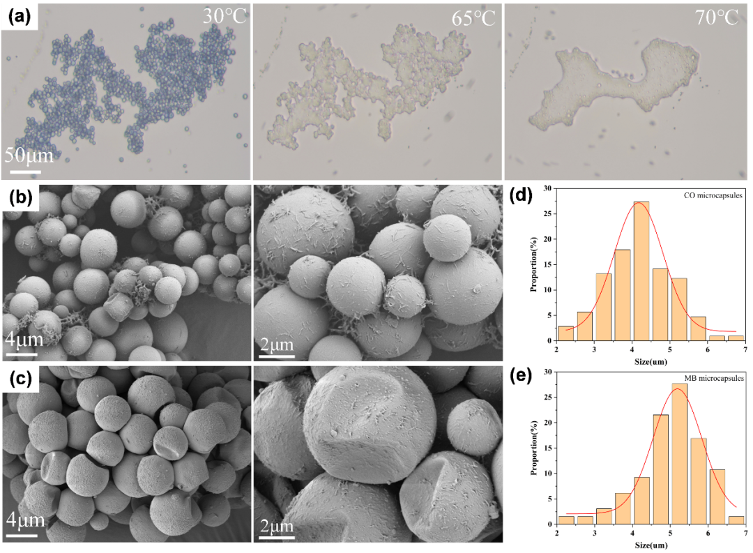 图 3.(a) TC-MB PEs 加热到不同温度时的光学显微图像:30、65 和 70°C。(b, d) TC-CO 和 (c, e) TC-MB 微胶囊的 SEM 图像和粒度分布图。