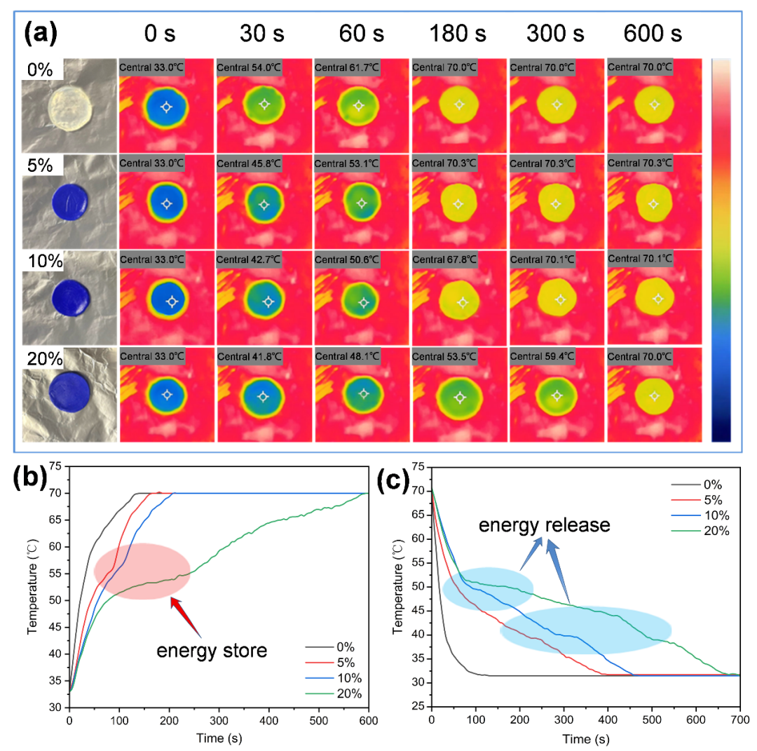 图 7.(a) 在 70 °C 下不同加热时间下,原始 WPU 薄膜和含有 5、10 和 20 wt.% TC-MB 微胶囊的 TC-MB 薄膜的红外热成像照片。 原始 WPU 薄膜和 TC-MB 薄膜在 (b) 在 70 °C 加热和 (c) 自然冷却期间的温度曲线随时间的变化。