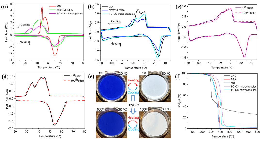 图 5.(a) 纯净 MB、CVL/BPA/MB 和 TC-MB 微胶囊的 DSC 曲线。(b) CO CVL/BPA/CO 和 TC-CO 微胶囊的 DSC 曲线。(c) TC-CO 和 (d) TC-MB 在第一次和第 100 次加热-冷却扫描时的 DSC 曲线。(e) TC-MB 微胶囊在 100 次加热-冷却扫描后的变色性能,(f)TGA 曲线。