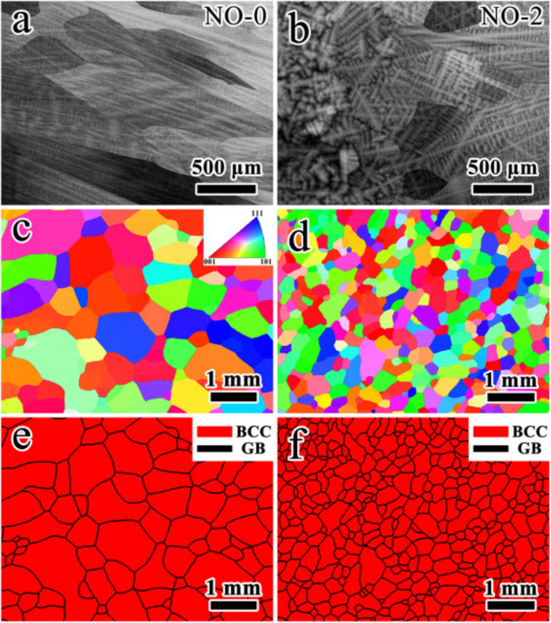 图1.晶粒尺寸尺度上合金的微观结构。(a) NO-0, (b) NO-2 合金的背向散射 EPMA 图像。(c) NO-0, (d) NO-2 合金的 EBSD IPF 分布图。(e) NO-0, (f) NO-2 合金的 EBSD 相图。