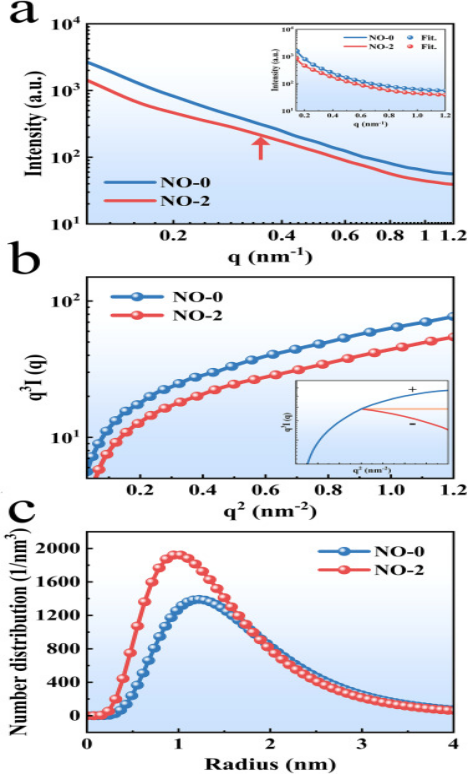 图3.(a) SAXS 图,插图表示球形颗粒尺寸分布模型的拟合曲线。(b) Porod 图,插图表示正 (+) 和负数 (-) 偏差。(c) NO-0 和 NO-2 合金中 LCO 的尺寸分布图。