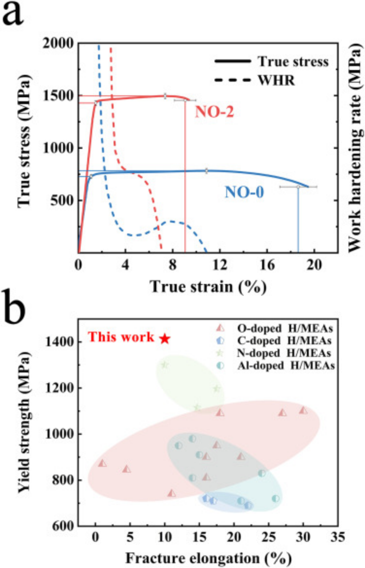 图2.NO-0 和 NO-2 合金的机械性能。(a) NO-0 和 NO-2 合金的真实应力-应变和 WHR 曲线。(b) NO-2 合金与其他代表性 RHEA 的屈服强度和伸长率比较