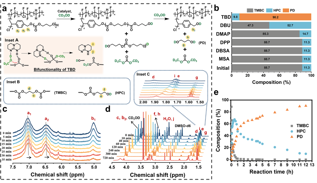 在 25 ℃下,选了六种常用的有机酸碱催化剂,借助对醇解产物 TMBC、HPC、PD 的组成分析(图4b),明确了TBD在此体系中的高效催化作用。使用原位核磁监测FC-H-T在醇解时特定化学位移的变化(图4c-d),原位分析溶液体系中化学结构演变(图4e),发现PTMC在30 min内被完全从主链“拆除”,然后降解为更低分子量的片段,最终逐渐演变为1,3-丙二醇。